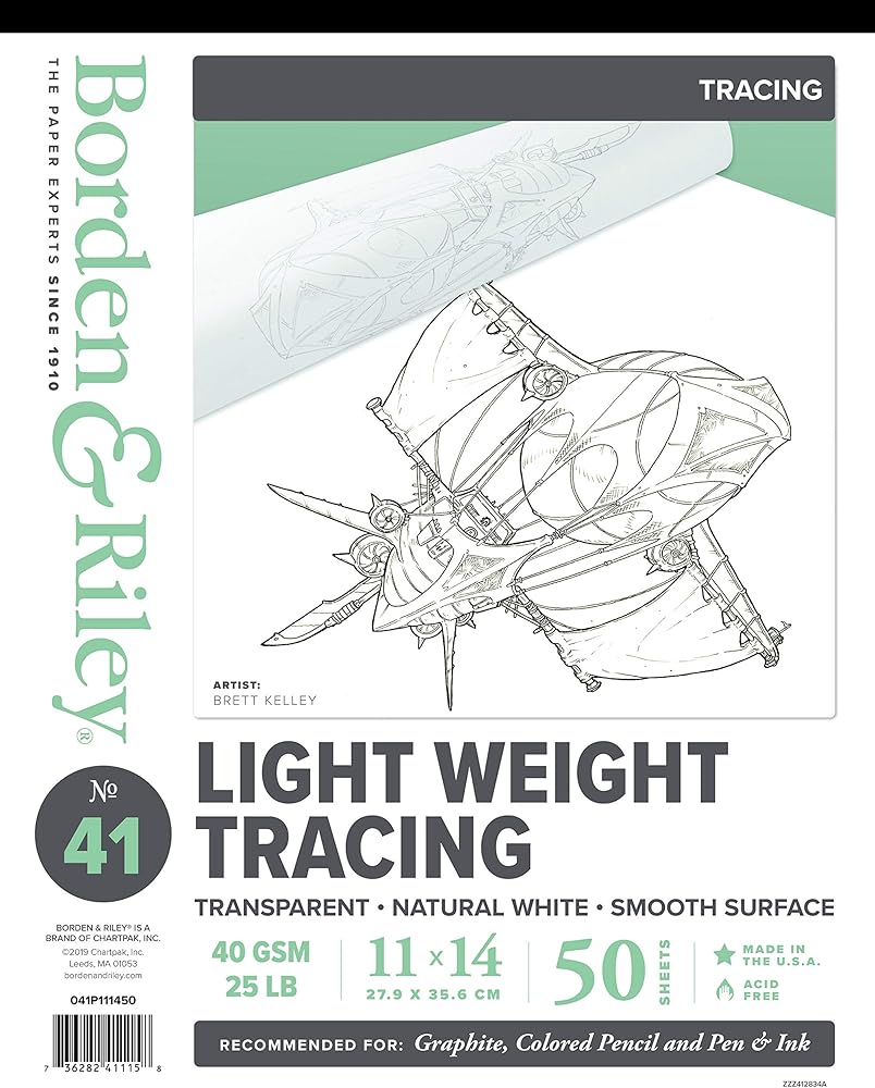 لوحة ورق تتبع خفيفة الوزن من Borden & Riley مقاس 11 بوصة × 14 بوصة #41، 40 جرامًا في المتر المربع/25 رطلًا، 50 ورقة بيضاء، وسادة واحدة لكل منها (041P111450)