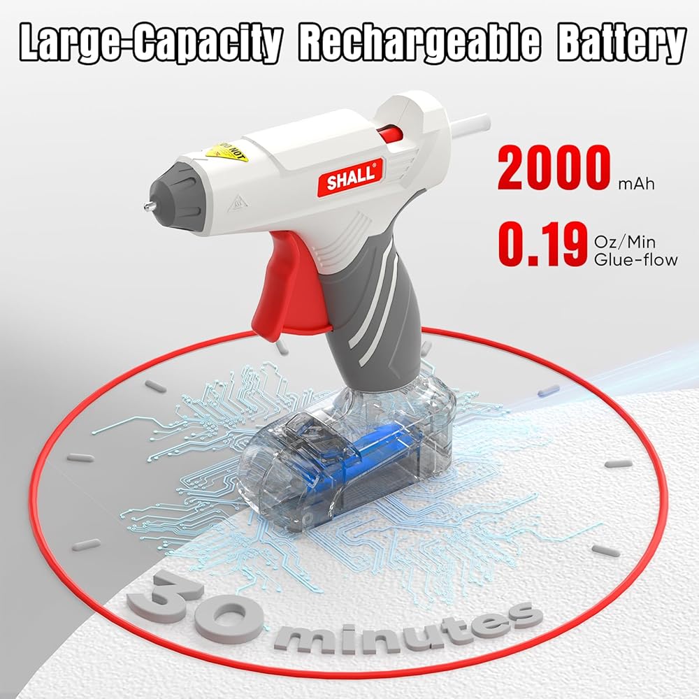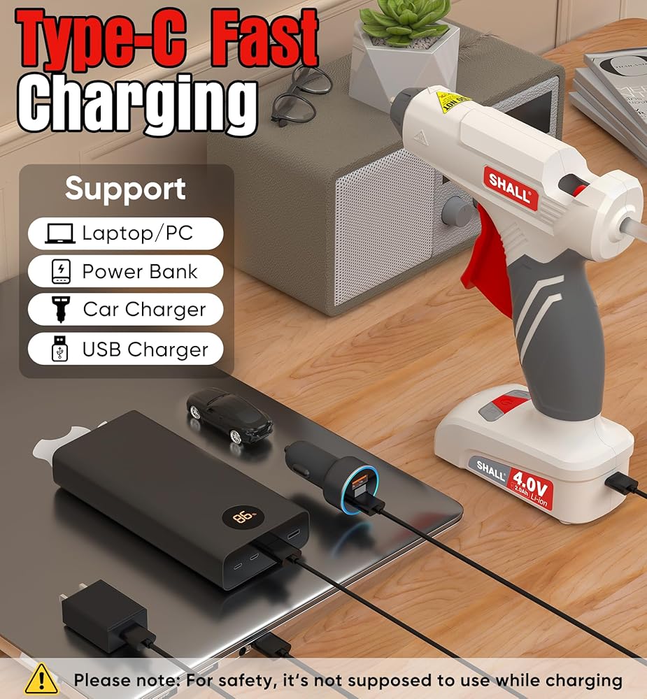 شحن سريع وبطارية طويلة الأمد: مجهزة ببطارية ليثيوم قابلة لإعادة الشحن بسعة كبيرة 2000 مللي أمبير تسمح بالعمل المستمر لمدة 30 دقيقة؛ تأتي مجموعة مسدس الغراء الساخن أيضًا مع شاحن سريع USB-C يستغرق 70 دقيقة فقط للشحن الكامل ويمكن توصيله بسهولة بالكمبيوتر المحمول وبنك الطاقة وشاحن السيارة والكمبيوتر والمزيد؛ يشير الضوء الأحمر إلى "انخفاض البطارية" أو "الشحن" بينما يشير الضوء الأزرق إلى "مشحون بالكامل"