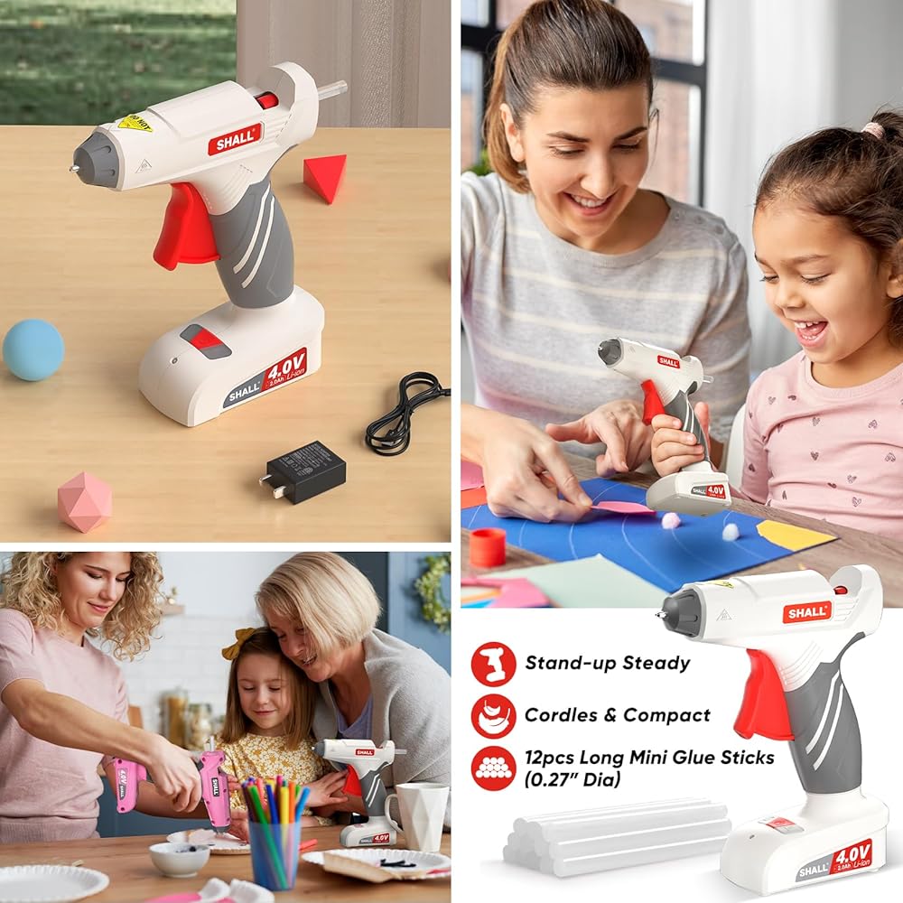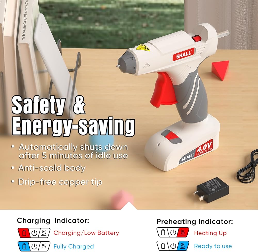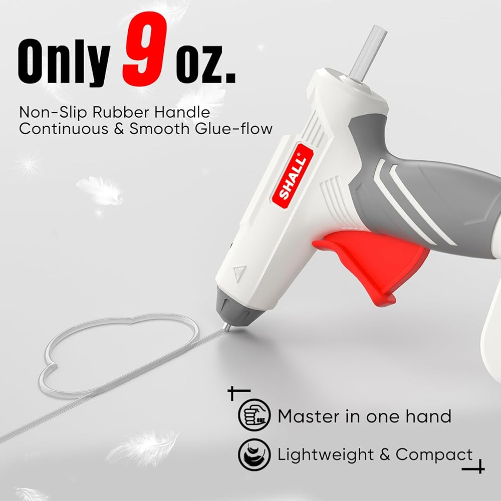 تصميم خفيف الوزن ولاسلكي: لاسلكي بوزن 9 أونصة. تصميم صغير وخفيف الوزن يجعل مسدس الغراء الحرفي سهل الحمل وسهل الاستخدام، مما يوفر الحرية المطلقة في صنع الأعمال الفنية