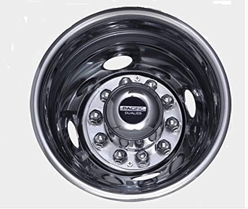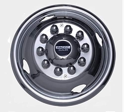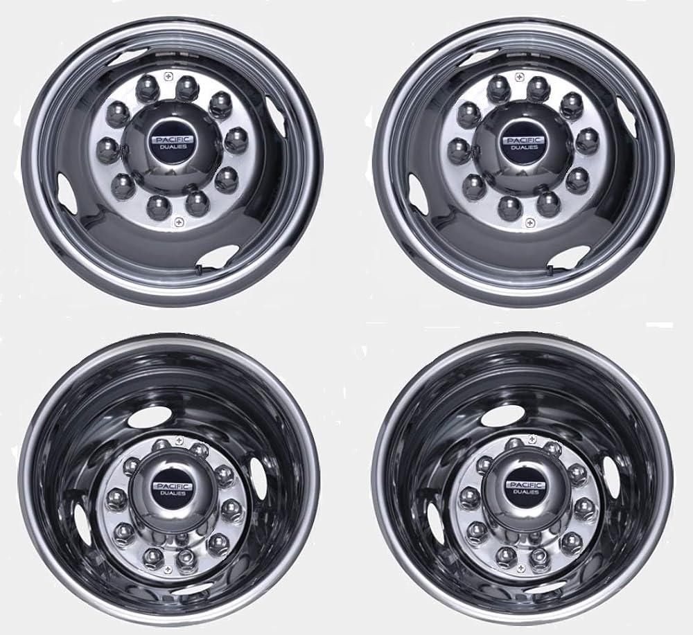 Pacific Dualies carries a spectrum of quality wheel simulators. Pacific Dualies wheel simulators are designed to mount securely to Ford vehicles with dual rear wheels, and are manufactured with quality in mind. They are manufactured from the highest grade of stainless steel. This product is a bolt-on style dually simulator for ten lug wheels. It is an appropriate fit for 16 inch wheels. The component parts of this wheel simulator are front wheel cover, front center cap, rear wheel cover, and rear center cap.