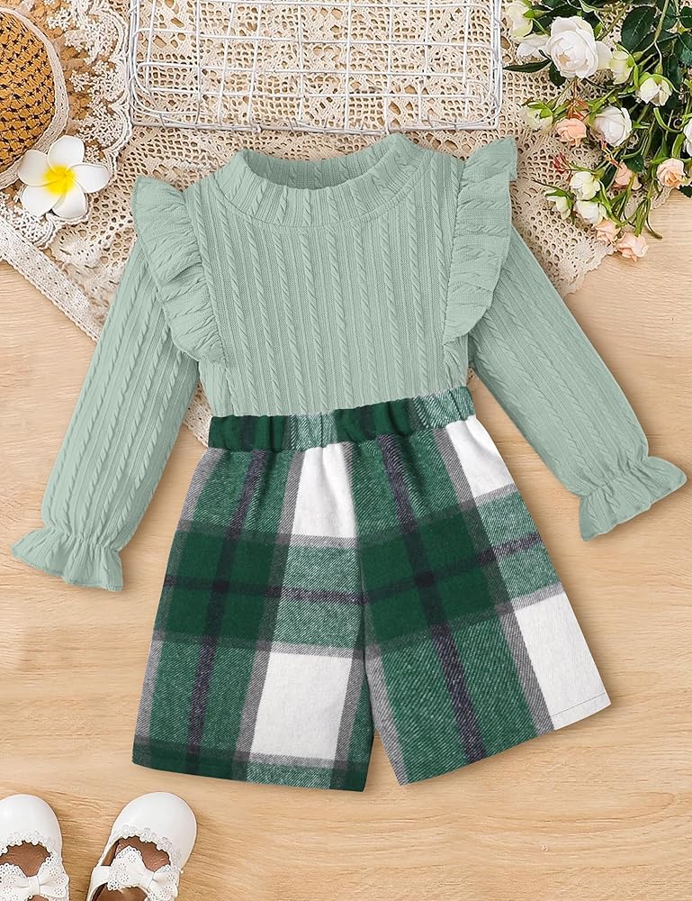 【رائعة وعصرية】ستبدو ملابس طفلتك الصغيرة رائعة للغاية في هذا الزي الذي يتميز بأكمام مكشكشة وسروال قصير بتنورة قصيرة منقوشة تتماشى مع عقدة لطيفة على شكل فيونكة. هذا التصميم الأنيق مثالي لأي مناسبة ويمكن ارتداؤه بمفرده أو مع قطع عصرية أخرى.