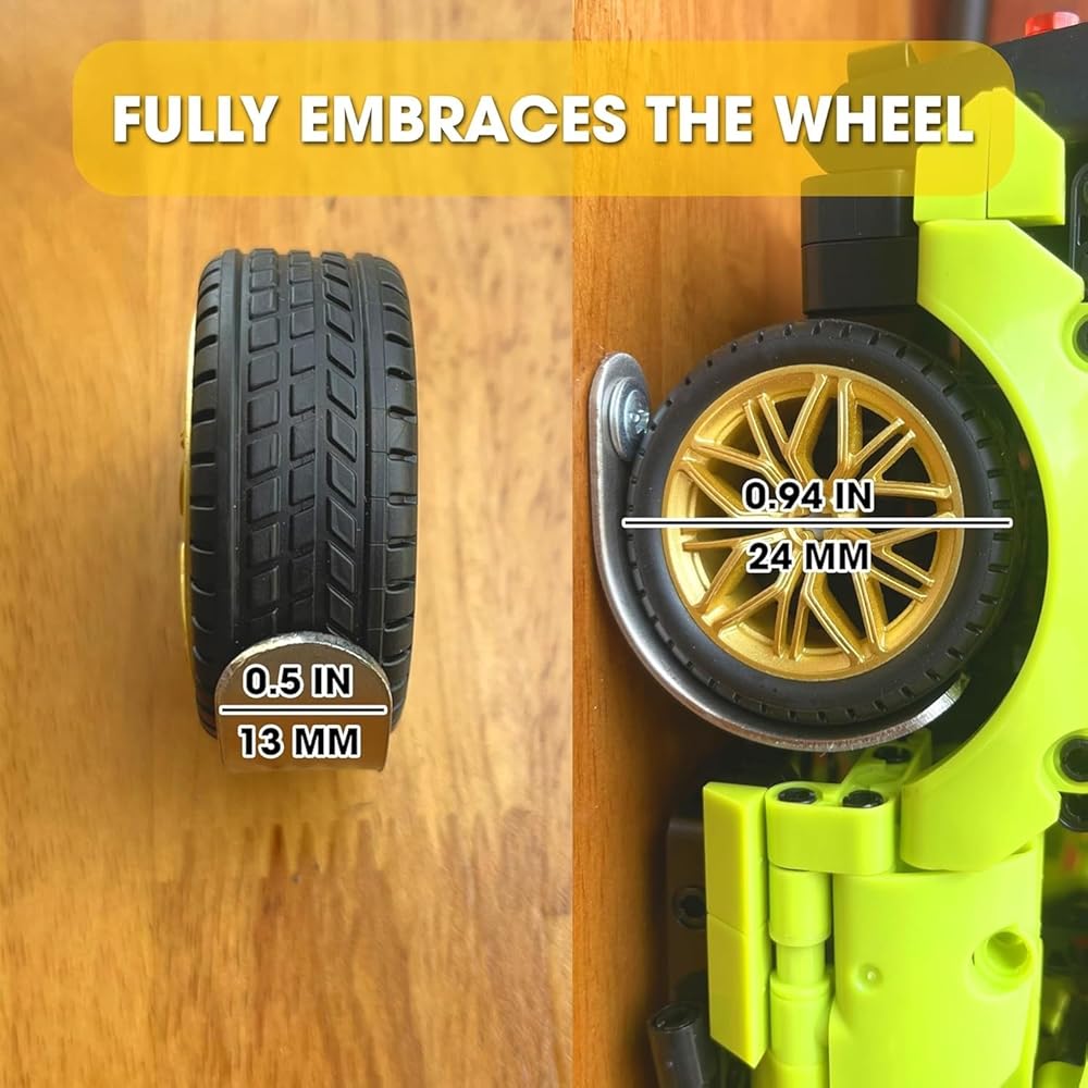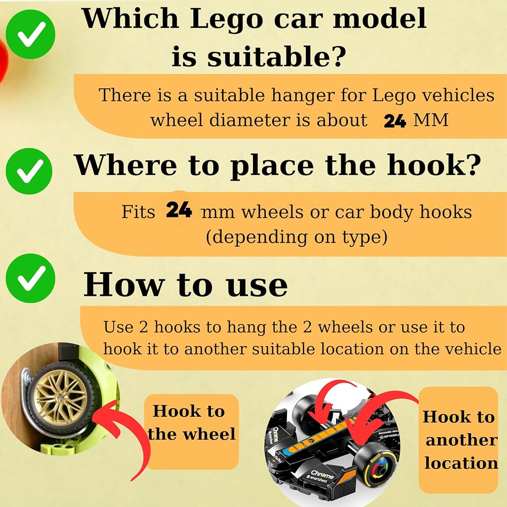 • استخدامات متعددة: علاقتان فرديتان مصممتان لتناسب عجلات السيارات الأكثر شعبية، والتي يبلغ قطرها حوالي 43.2 مم مثل تكنيك وبوجاتي وأبطال السرعة لامبورجيني وخطافات بديلة على لوحة حائط العرض لطراز السيارة