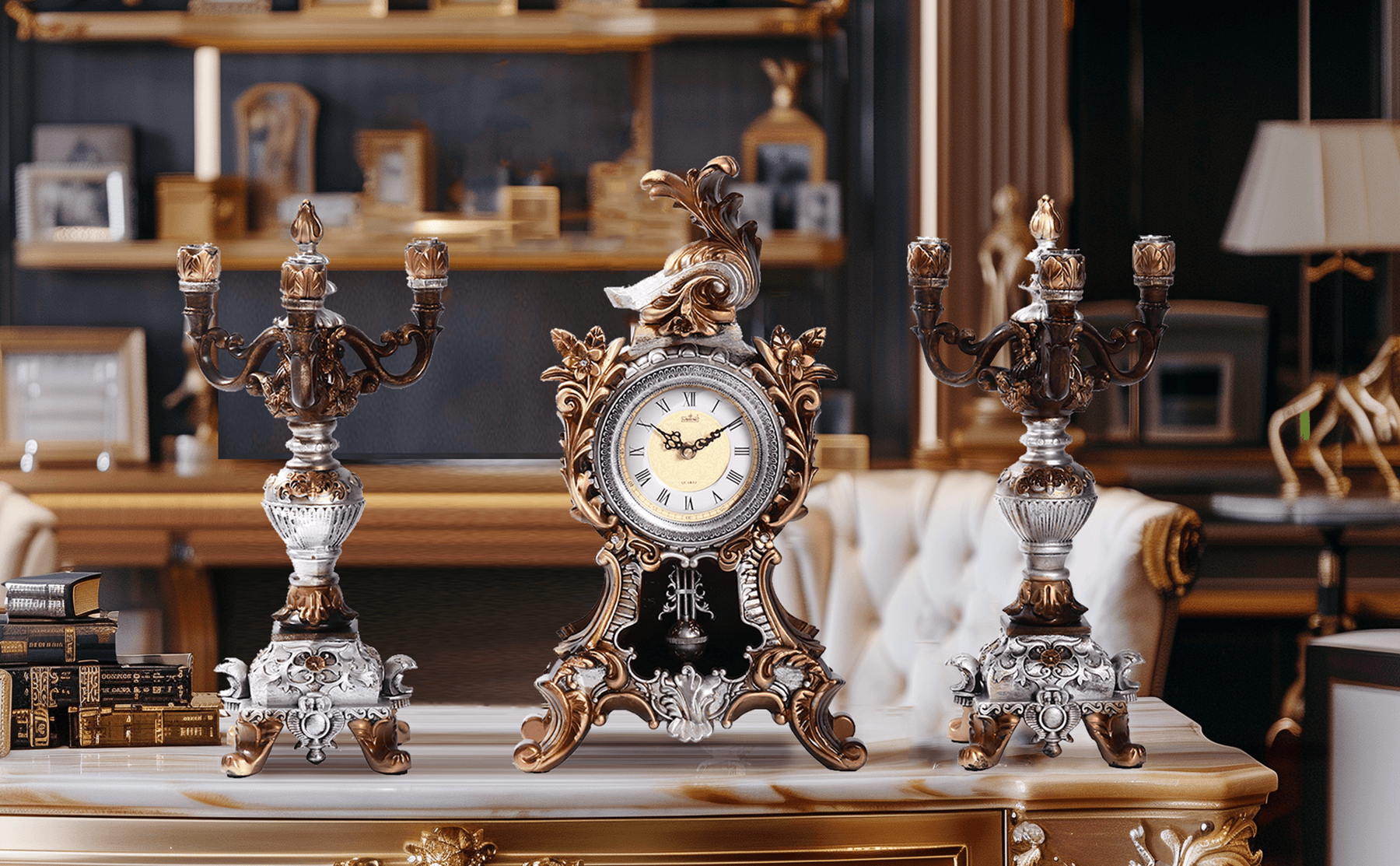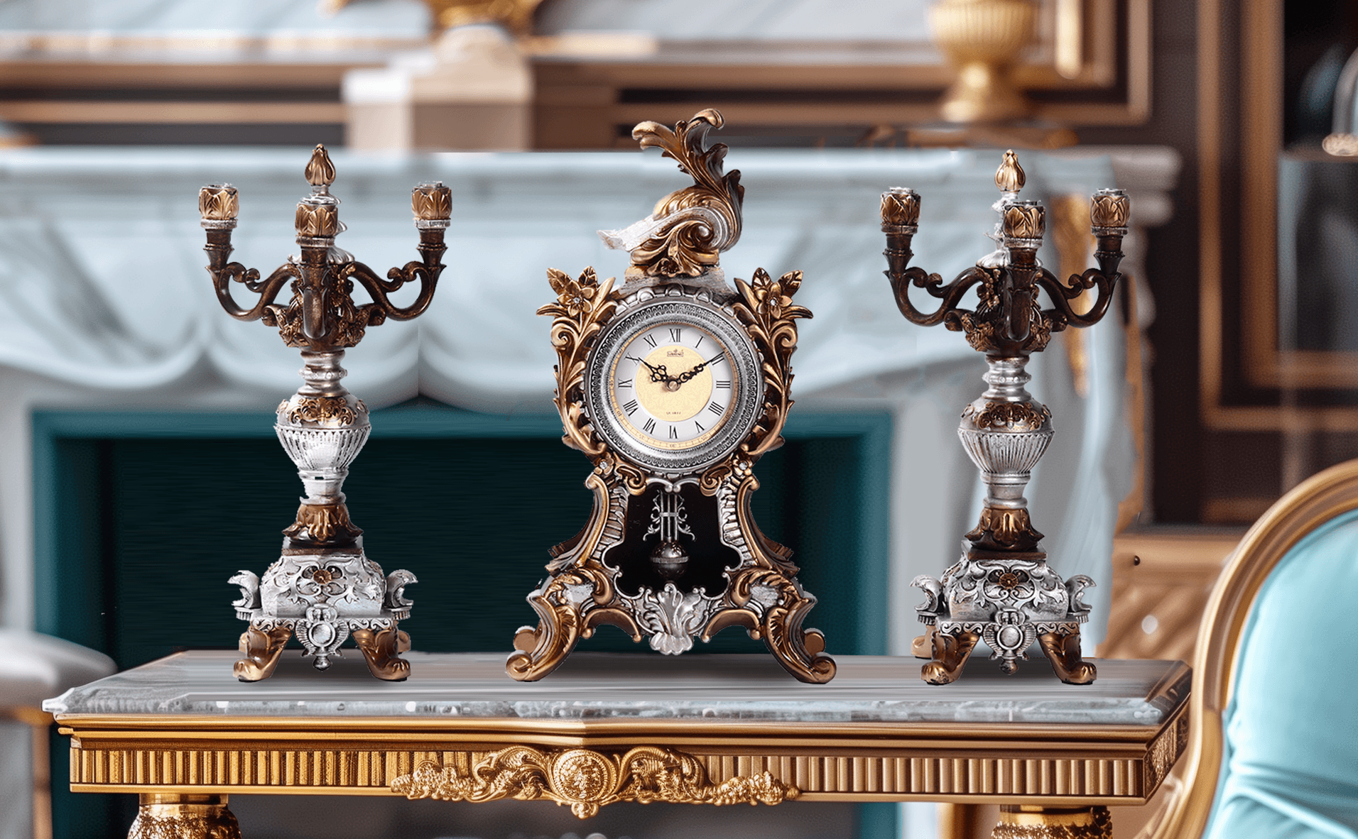 لمسة نهائية أنيقة باللونين الذهبي والفضي: تتميز الساعة والشمعدانات بمزيج متناغم من اللمسات النهائية الذهبية والفضية، مما يخلق مظهرًا راقيًا وفاخرًا يكمل مختلف الأنماط الداخلية.