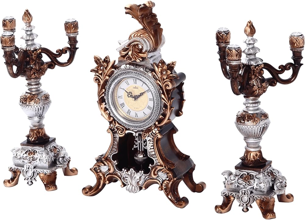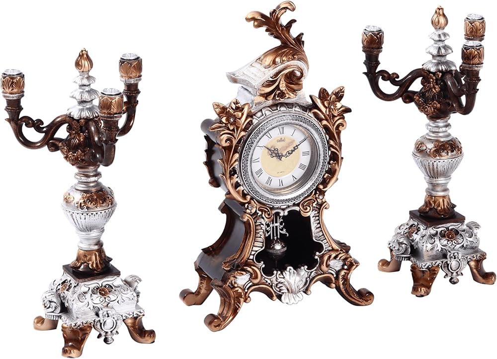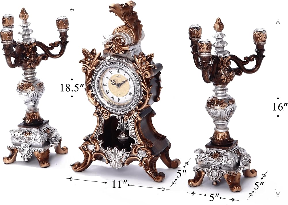 18.5''h الروكوكو نمط البندول ساعة رف على مدار الساعة مع 2 الشمعدانات حاملي الشموع الباروك الراتنج ساعة مكتب ساعة الذكرى السنوية لغرفة المعيشة غرفة نوم ديكور مكتب الموقد