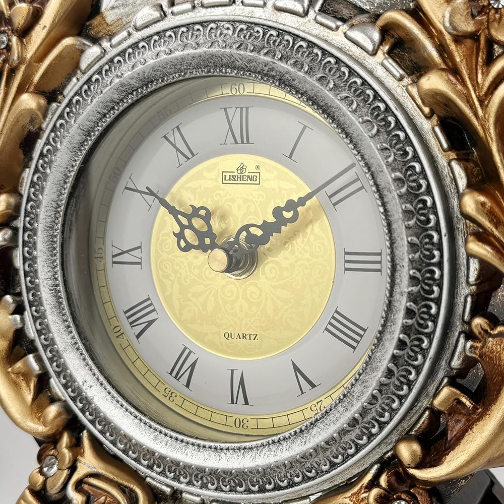 أرقام رومانية كلاسيكية: وجه الساعة مزين بأرقام رومانية وعقارب سوداء مزخرفة، مما يضيف سحرًا تقليديًا لا يتأثر بمرور الزمن يعزز مظهره العتيق.