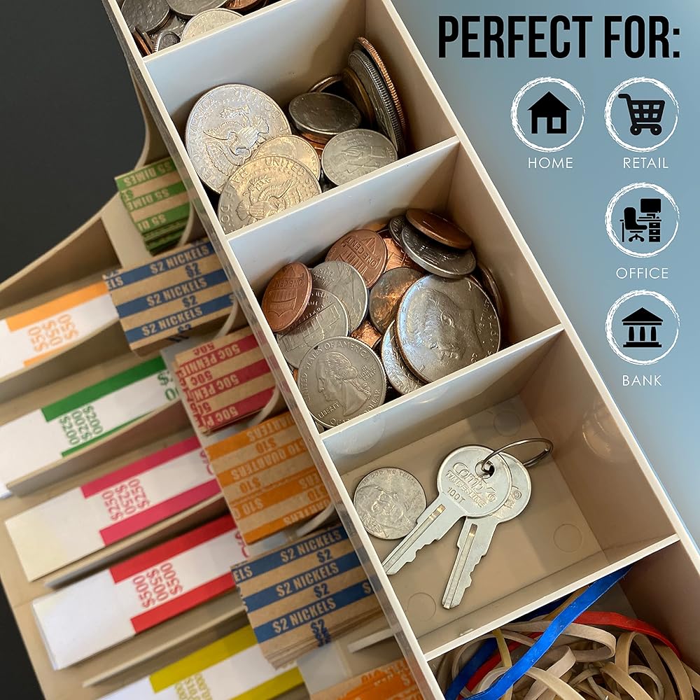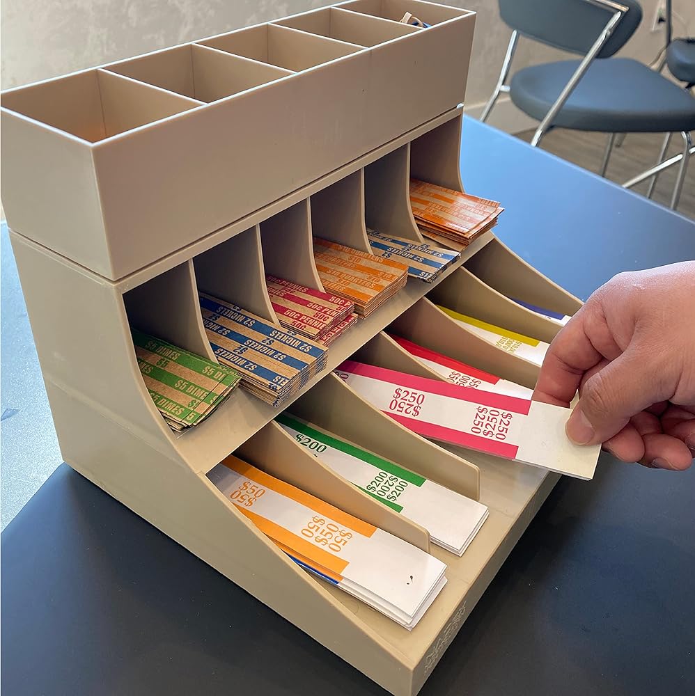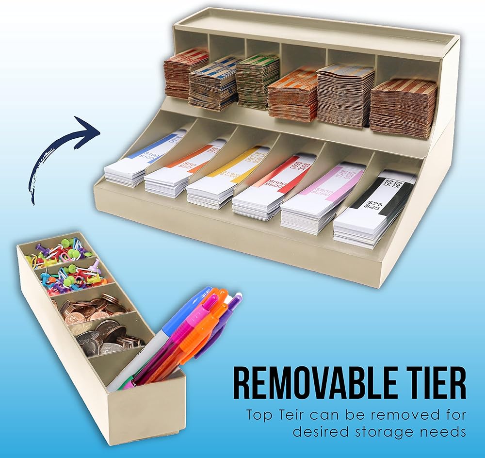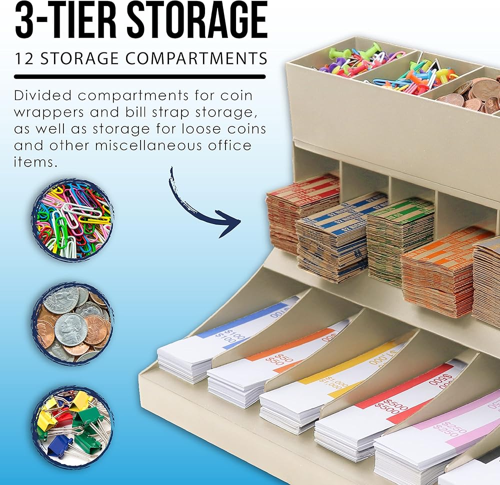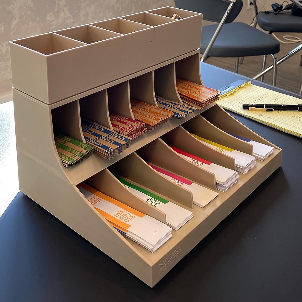 - يوفر الرف ذو الثلاث طبقات مساحات مقسمة لأغلفة العملات المعدنية وتخزين حزام الفواتير.