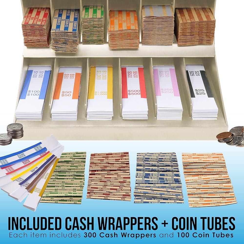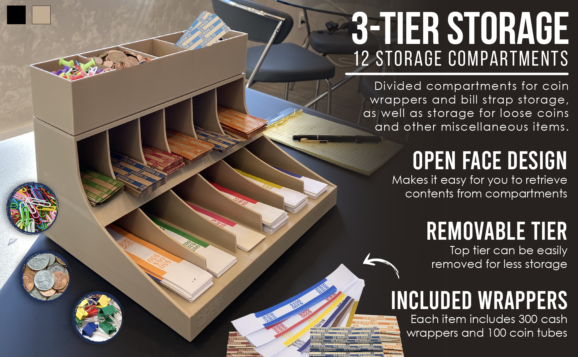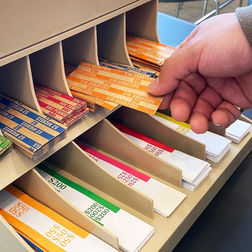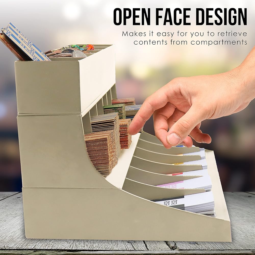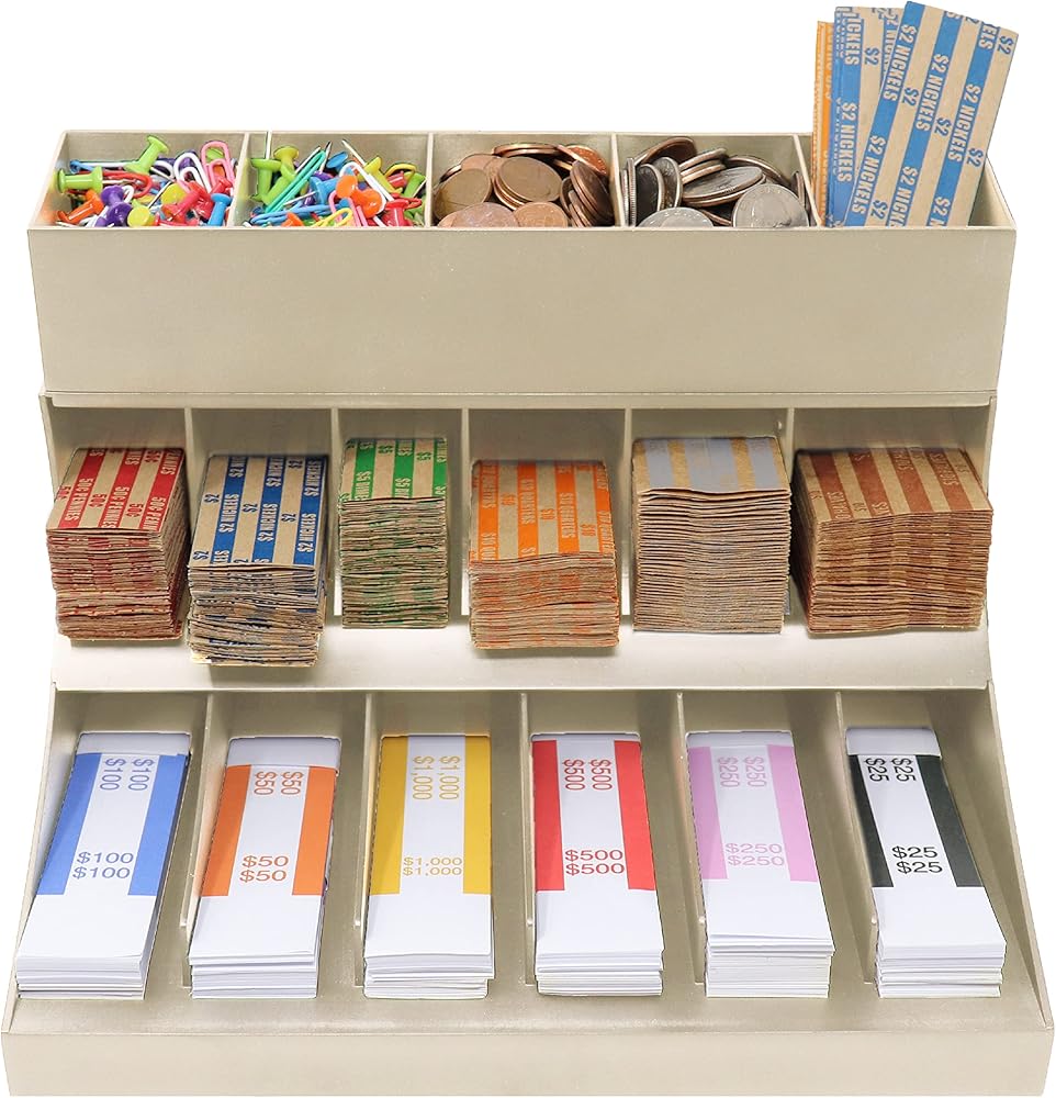 - يوفر الرف ذو الثلاث طبقات مساحات مقسمة لأغلفة العملات المعدنية وتخزين حزام الفواتير.