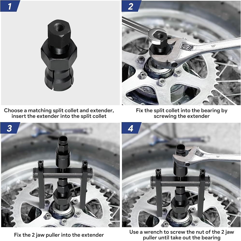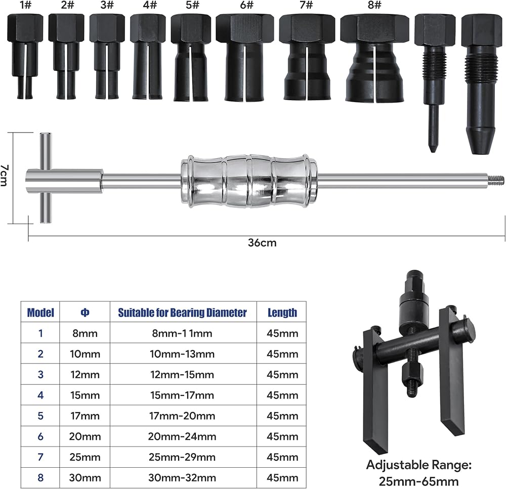الاستخدام: 8 أطواق مقسمة مختلفة مناسبة لقطر المحمل من 8 مم إلى 32 مم. ساحب المحمل الأعمى مناسب للدراجات النارية والسيارات المدمجة والسيارات متوسطة الحجم وما إلى ذلك