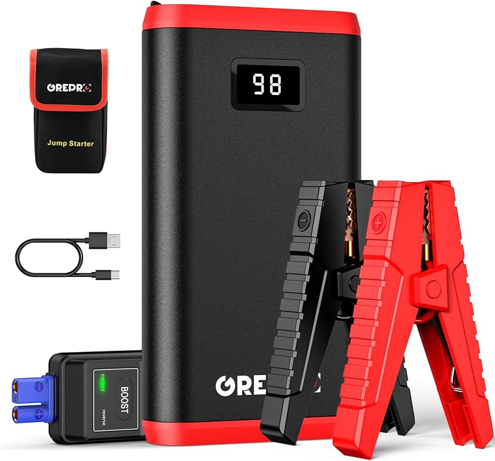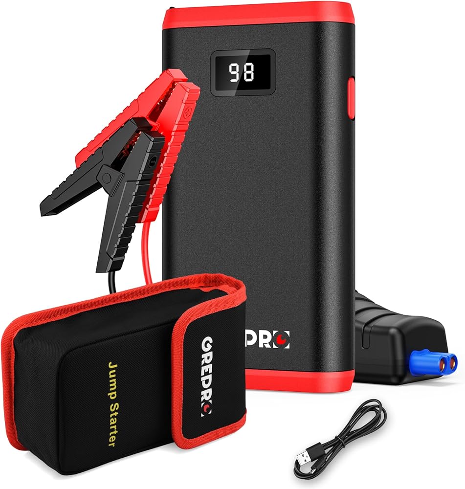 GREPRO بطارية السيارة Jump Starter، بطارية 2000 أمبير محمولة لما يصل إلى 7.0 لتر من الغاز أو محركات الديزل 5.5 لتر، صندوق توصيل 12 فولت لبطارية السيارة مع شاشة LCD، 3 أوضاع مصباح يدوي، مخرج USB مزدوج