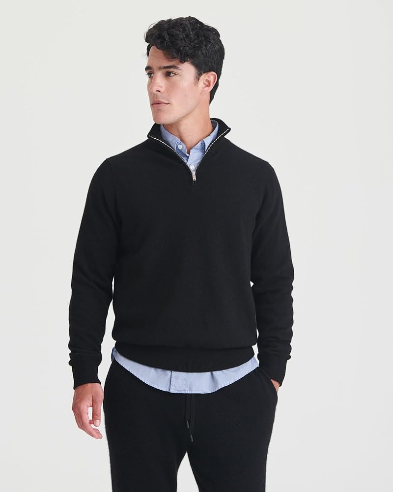 The Soft By Naadam Cashmere Quarter Zip is a soft, versatile pullover with a classic fit. It features a stand-up collar, ribbed details, and quarter zip neckline.
