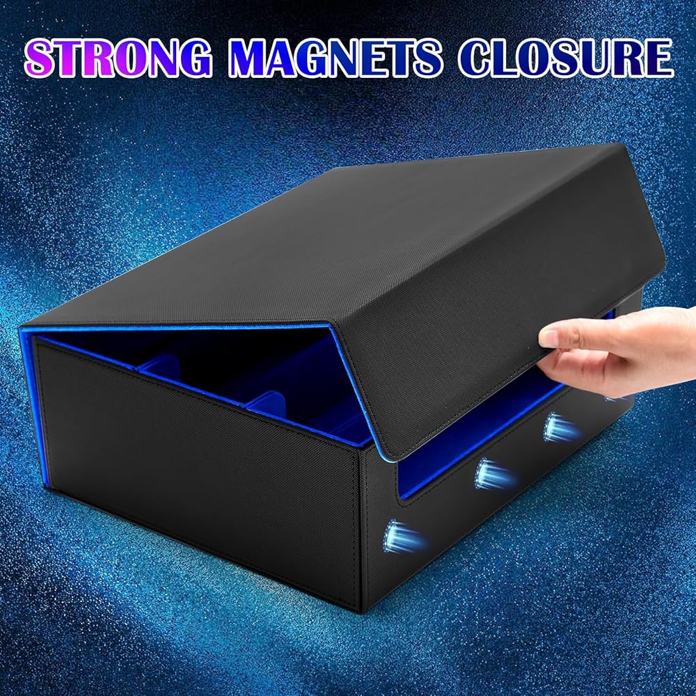 【تصميم مغناطيسي قوي】: يتميز صندوق البطاقات الجماعي الخاص بنا بإغلاق مغناطيسي قوي، حتى إذا قمت بهز صندوق البطاقات، فلن يفتح الإغلاق ولن تسقط بطاقات التداول، مما يضمن سلامة بطاقاتك دون أي ضرر.