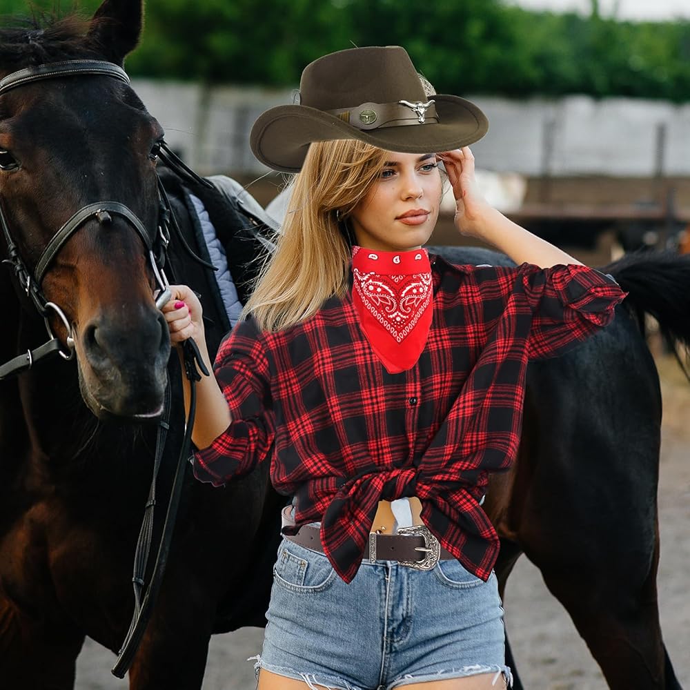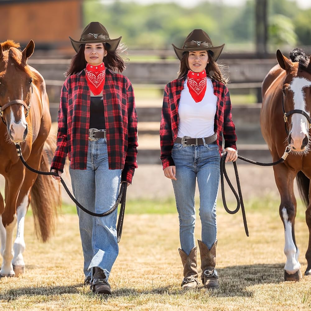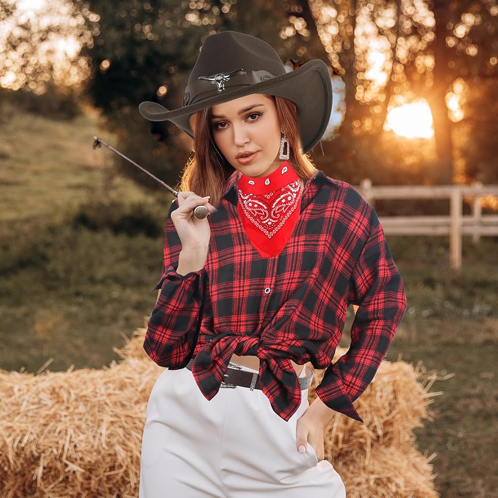 • 【Suitable Size】The plaid shirt for women is available in various sizes - M, L, XL. The womens western hat has a head circumference of approximately 22-22.8 in, and the bandana measures about 21.7 x 21.7 in, the belt is about 47 inch ,making them suitable for most adults. Ensure the perfect fit by choosing the right size.