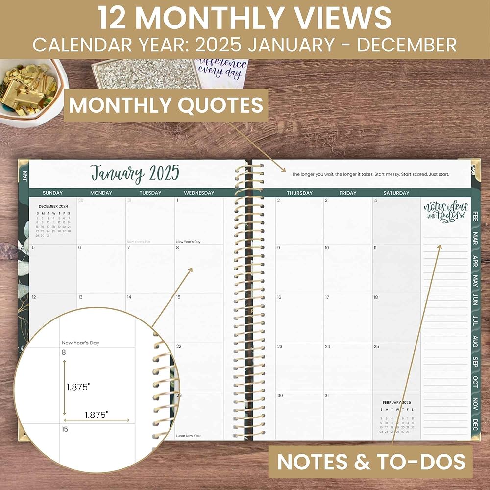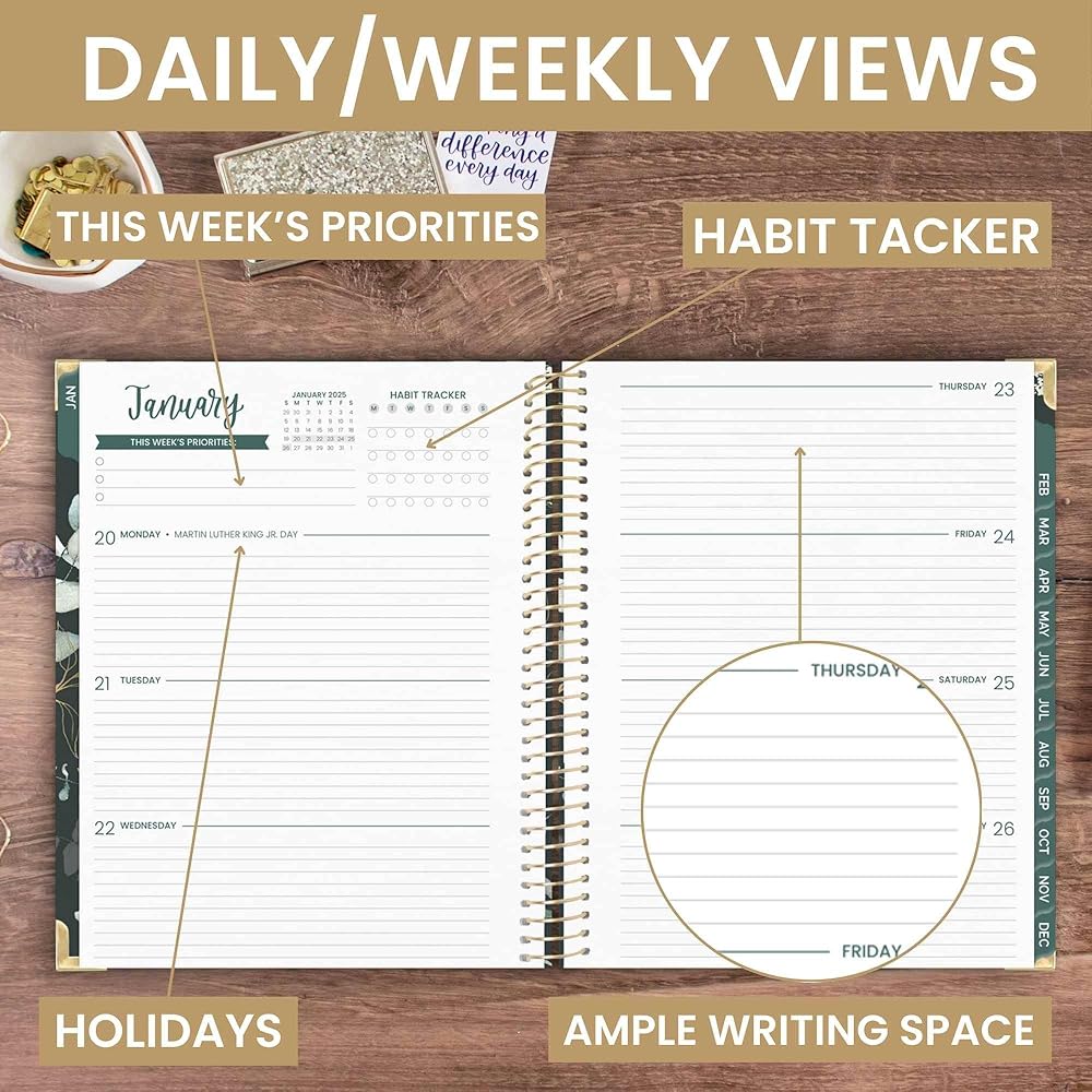 الأبعاد والتصميم: 8.5 بوصة عرض × 11 بوصة طول. تتوفر أيضًا خيارات مخطط أصغر! نظرة عامة شهرية مكونة من صفحتين وعروض أسبوعية واسعة تمتد على مدار السنة التقويمية، يناير 2025 حتى ديسمبر 2025 - 365 يومًا من التخطيط! تكون المشاهدات الأسبوعية أفقية وتتضمن تتبع الأولويات والعادة
