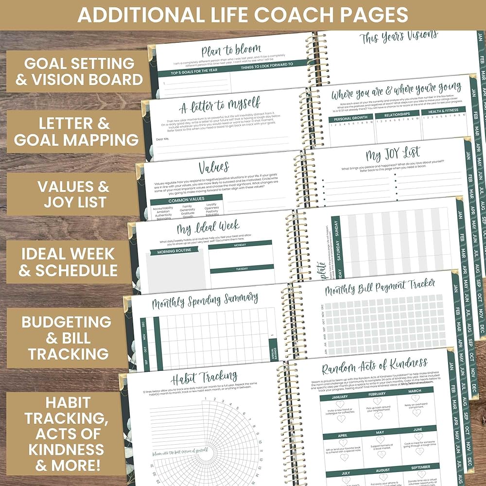 علاوة: مليئة بأوراق عمل التدريب على الحياة وميزات ملهمة لمساعدتك على تحديد وتحقيق جميع أهدافك لهذا العام: بيان المهمة الشخصية وصفحة تحديد الأهداف السنوية والسريعة، وقوالب الجدولة الأسبوعية، وصفحة القيم، وتتبع العادات، ولوحة الرؤية، وسجل الإنفاق الشهري ، 16 صفحة ملاحظات، اقتباسات ملهمة، تحديات شهرية، والمزيد!