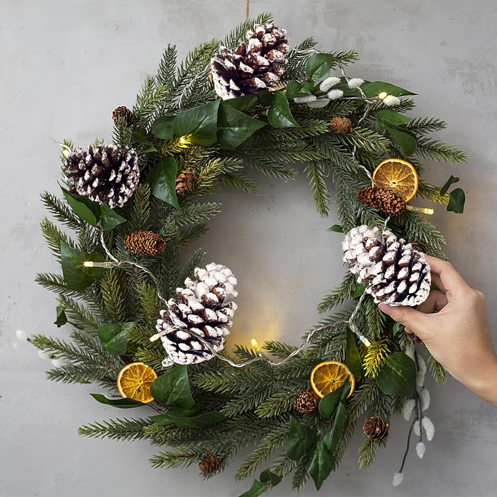 • مخاريط الصنوبر الطبيعية - يتم اختيار أكواز الصنوبر الكبيرة هذه يدويًا تحت أشجار الصنوبر ومعالجتها بتقنية الحفاظ عليها لاستخدام طويل الأمد، ومطلية بطبقة "ثلجية" (ورنيش مائي)، وغير سامة وعديمة الرائحة، وليس من السهل أن تهلك أو تهلك. تعفن.