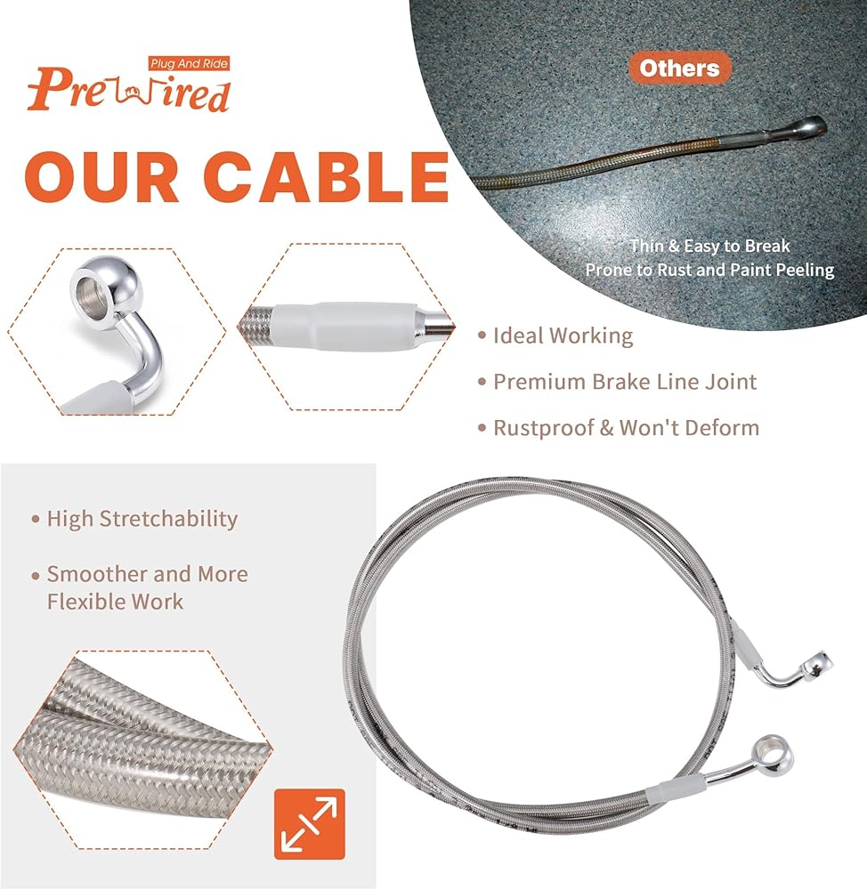 • مصممة بشكل متين ومظهر حاد: نحن نتحدث هنا عن كابلات مضفرة من الفولاذ المقاوم للصدأ مطورة، خط فرامل الشماعات Softail هذا ليس قويًا وسميكًا فحسب، ولكنه أنيق أيضًا. لن تعبث بأي مكان تلمسه، وهذا السلك الداخلي يعني أنها ستستمر في العمل لفترة خدمة طويلة.