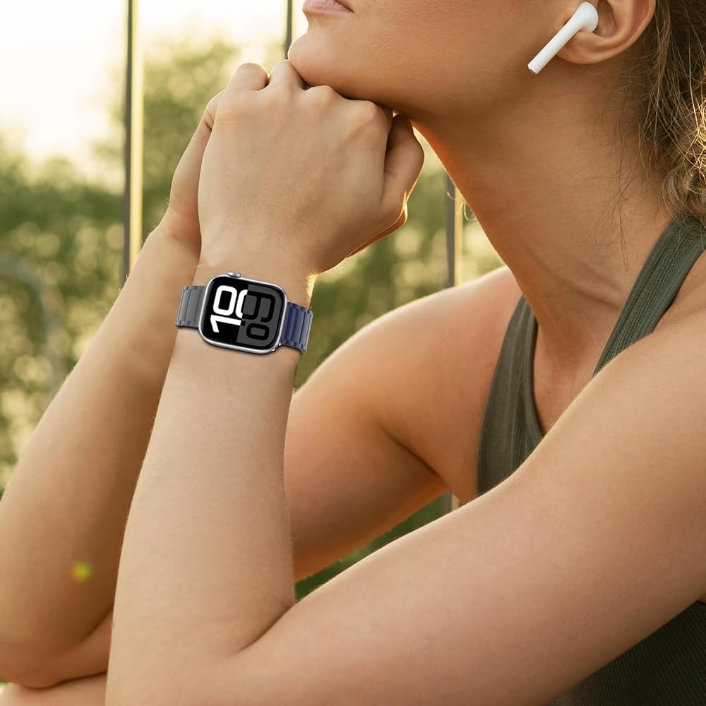 【تصميم فريد】تصميم إغلاق مغناطيسي فريد، يمكن إغلاقه بشكل آمن بدون مشبك. يمكن بسهولة وضع سوار الساعة أو إزالته. قوة مغناطيسية قوية تضمن السلامة، حزام مقاوم للماء حتى أثناء ممارسة التمارين أو الظروف الرطبة. التصميم المتموج للمرونة المتوافقة مع سوار ساعة ابل مصمم لتهوية أفضل والتعرق
