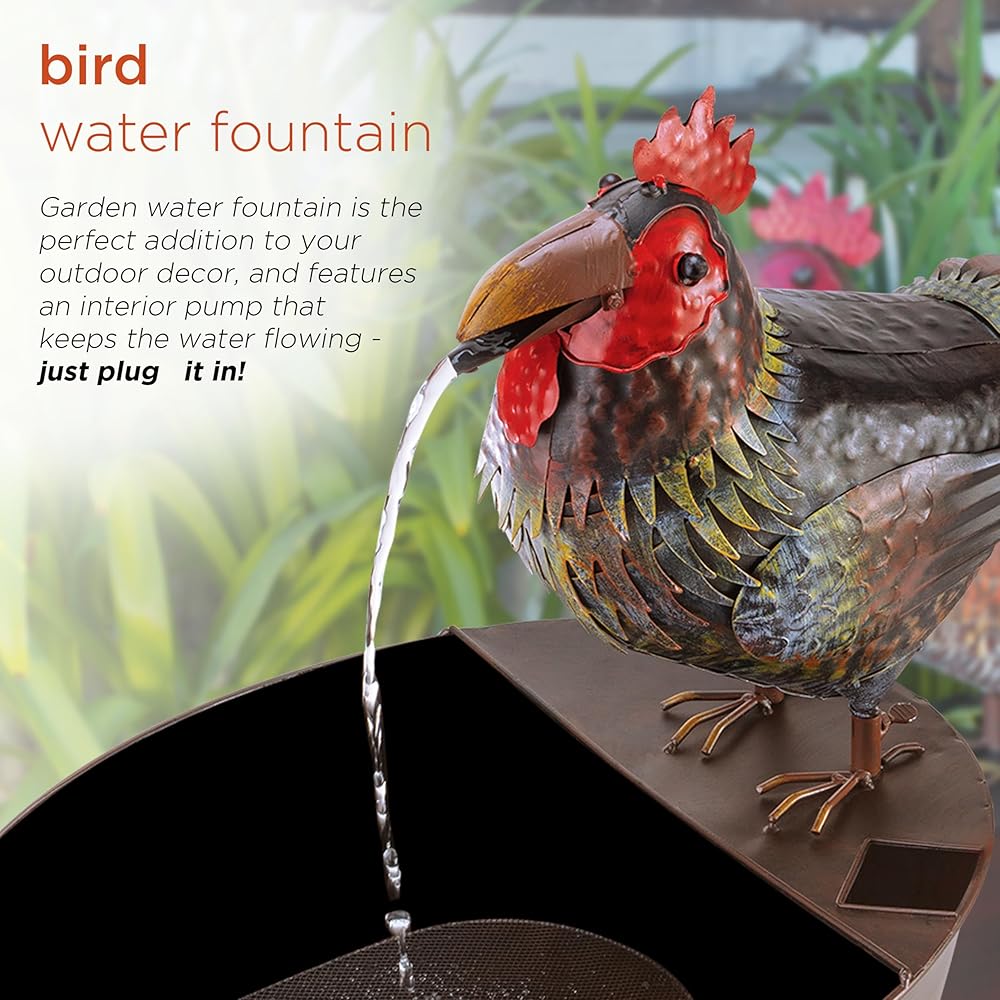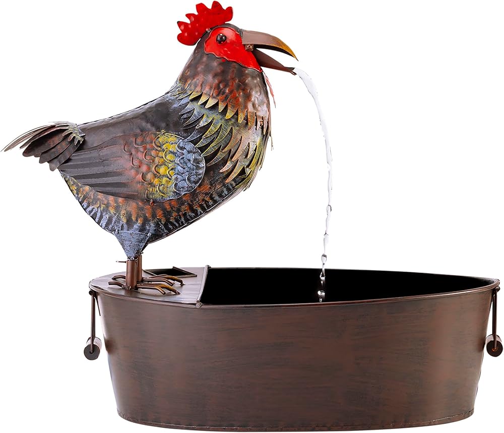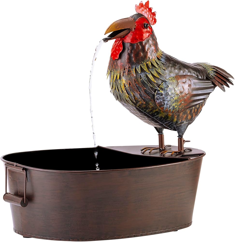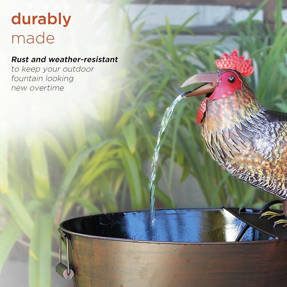 PLAYFUL WATER FLOW: Water falls from the rooster's opening and closing mouth for a whimsical and relaxing flow