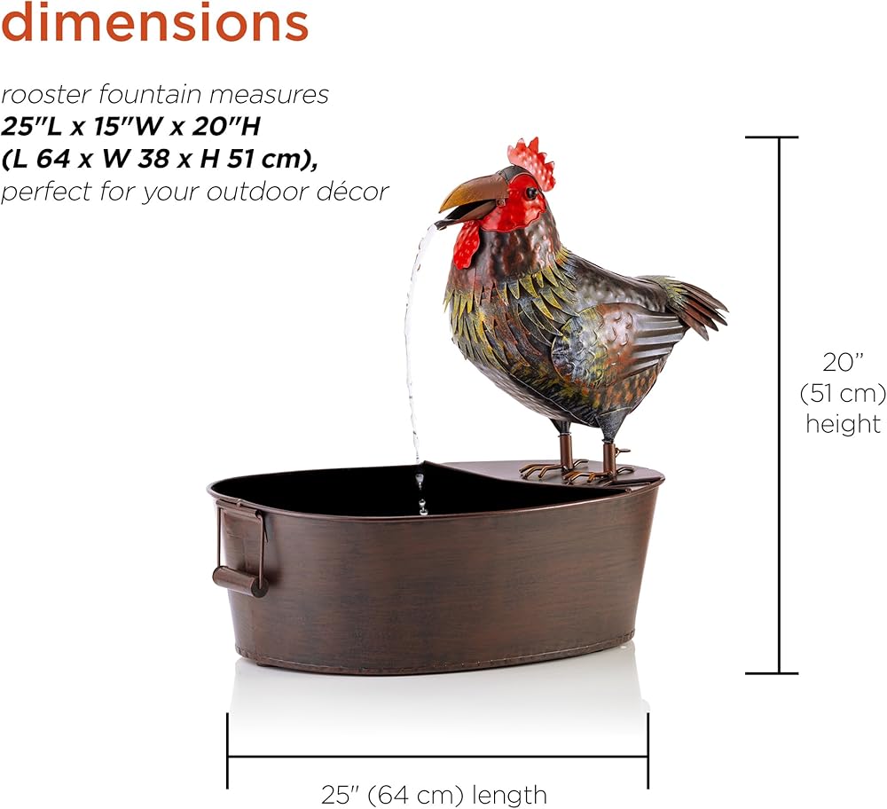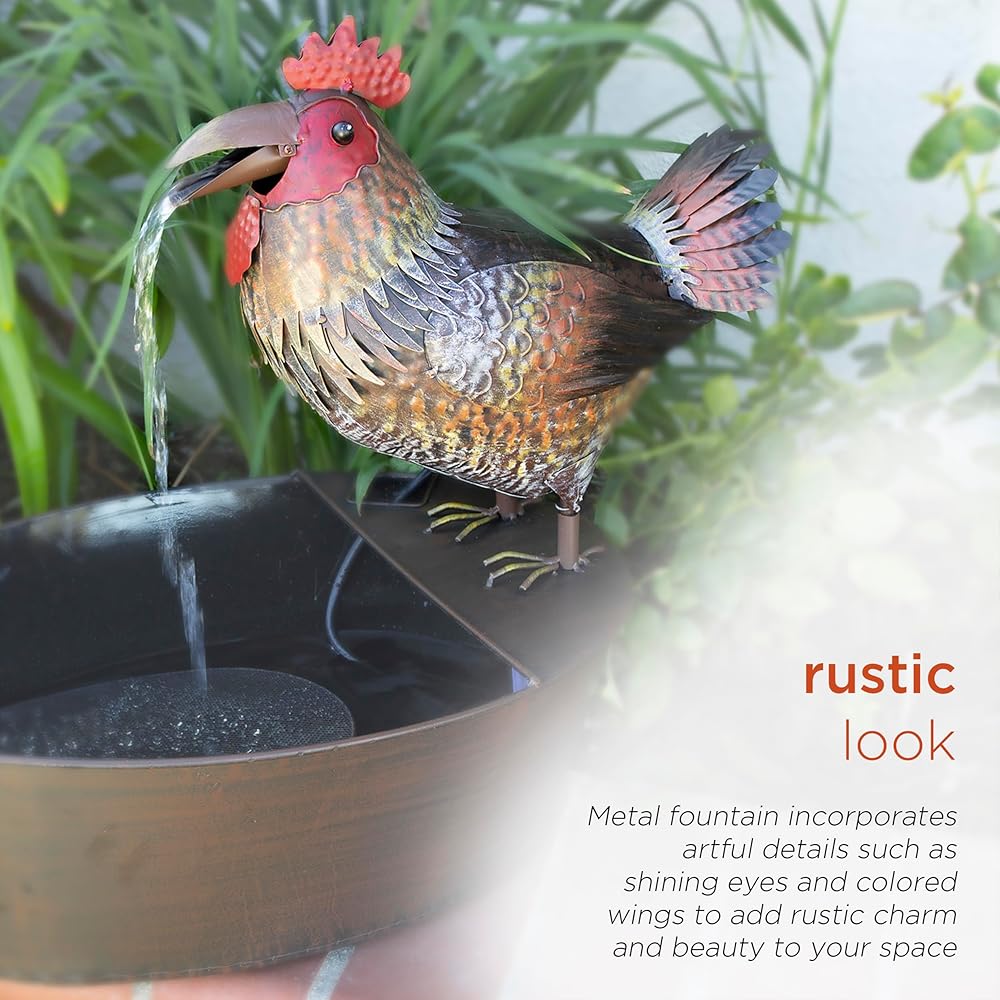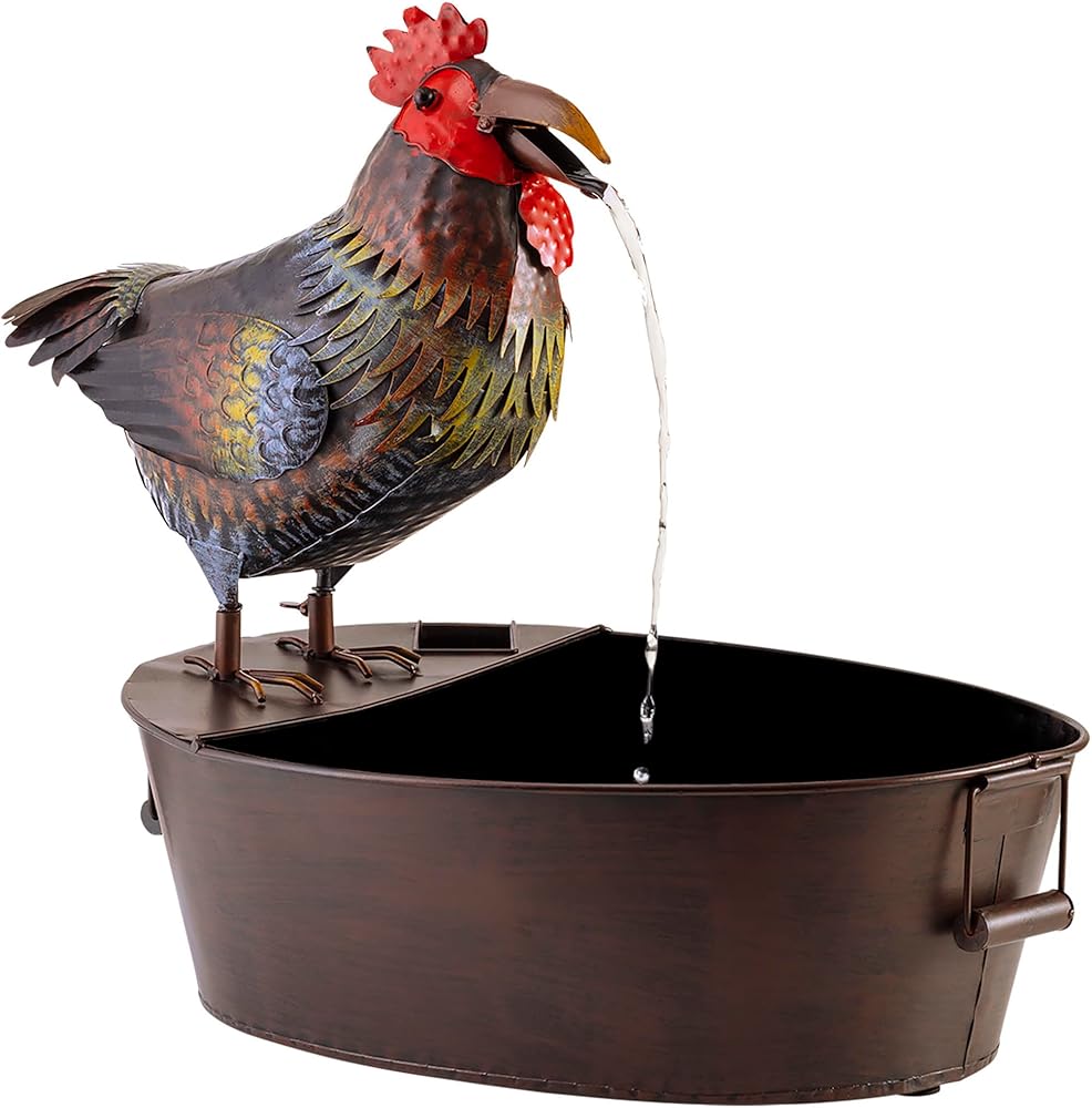 PLAYFUL WATER FLOW: Water falls from the rooster's opening and closing mouth for a whimsical and relaxing flow