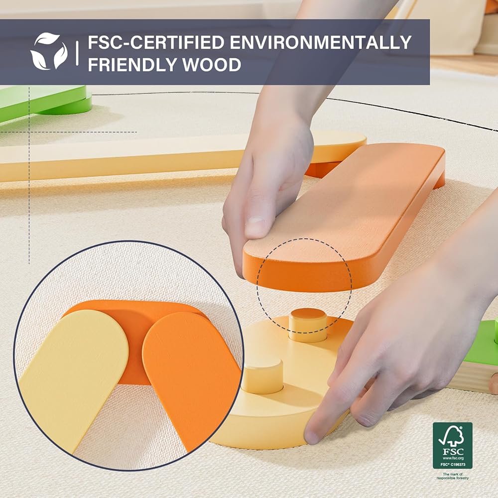 مستدامة: عوارض التوازن الخاصة بنا مصنوعة من الخشب الطبيعي بنسبة 100% المعتمد من مجلس رعاية الغابات (FSC) ومغطاة بطلاء صديق للبيئة. كما أنها تلبي معايير السلامة العالمية من خلال اجتياز اختبارات صارمة مثل ASTM F963-17، وCPSIA، وCPC.