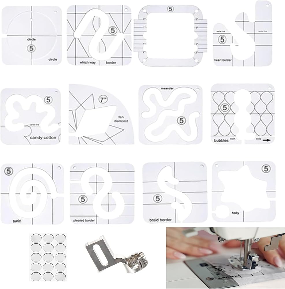 ما ستحصل عليه: سوف تحصل على 11 قطعة × قالب اللحف، 1 قطعة × إطار اللحف، 1 قطعة × قدم الضغط، 1 مجموعة × حصيرة غير قابلة للانزلاق، في عبوة واحدة. كل قالب هو شكل مختلف، تصميم مجوف، عملي للاستخدام تصميم أنواع مختلفة من اللحف