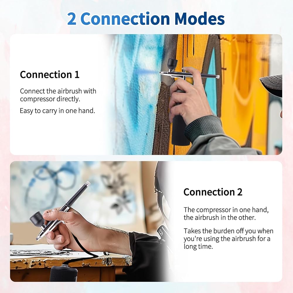 [وضعان للاتصال] يتم توفير خرطوم هواء مجدول مع مجموعة فرش الهواء اللاسلكية الخاصة بنا. بالإضافة إلى توصيل الضاغط المحمول مباشرة بالمسدس، يمكنك أيضًا توصيل الضاغط بجسم البخاخة عبر خرطوم الهواء. ضع ضاغط فرشاة الهواء الكهربائية الصغيرة في جيبك وأمسك قلم فرشاة الهواء للرش، وسوف تستمتع براحة كبيرة أثناء العمل