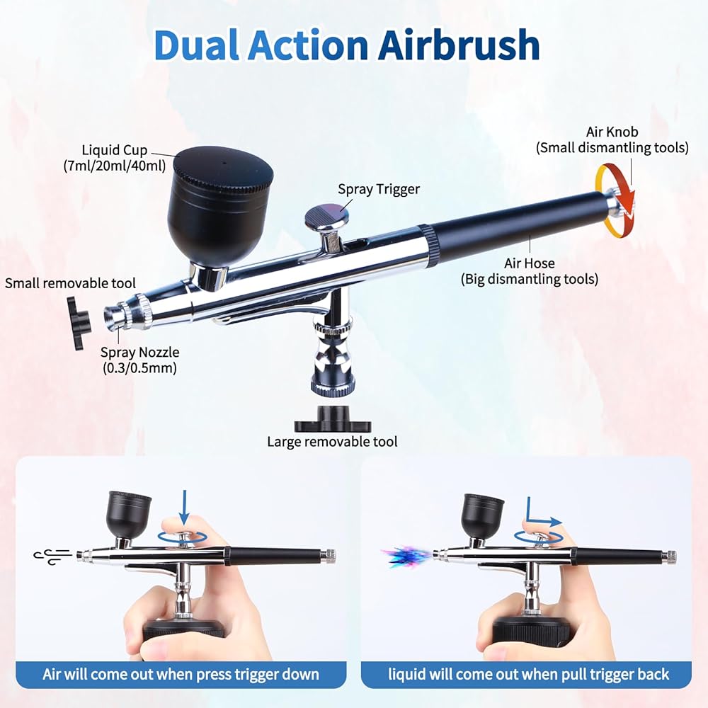 [مجموعة بخاخة مزدوجة الحركة مع ضاغط] فرشاة هوائية مزدوجة الحركة عالية الأداء من إيزي 2 إتش دي، لا يمكنك فقط التحكم في السائل من خلال نهاية المسدس، ولكن يمكنك أيضًا التحكم في كمية الطلاء والهواء من خلال الزناد الموجود على البخاخة مما يوفر تدفق أكثر سلاسة واستقرارًا للطلاء. فوهة الهواء 0.3 / 0.5 مم يمكن أن تلبي احتياجاتك للخطوط الدقيقة والعمل بمساحة كبيرة. عند استلام المنتج، قم بتوصيل البخاخة بالضاغط قبل استخدامه