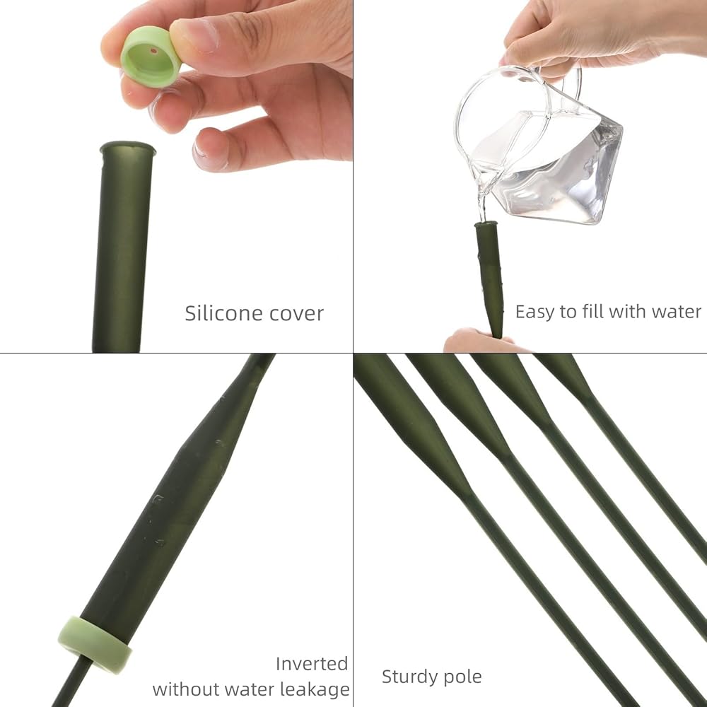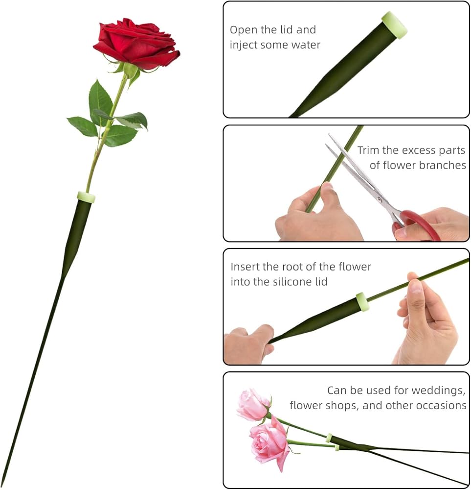 سهلة الاستخدام: تتميز أنابيب المياه ذات جذع الزهرة ذات النمط المدبب باختيارها في الأسفل والتي يمكن لصقها مباشرة في الرغوة أو التربة. فقط املأها بالماء، وأغلق الغطاء، وأدخل جذع الزهرة في الفتحة.
