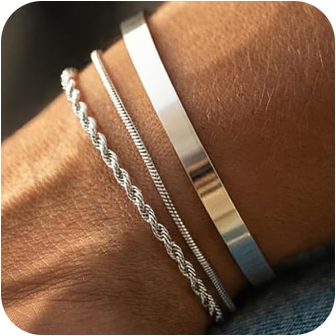 أساور مكونة من 3 قطع: أساور رجالية فضية أنيقة تتميز بتصميم عصري ورقيق، يتضمن سلسلة أساور وسلسلة ثعبان وسلسلة حبل. إنها مناسبة للتكديس وكذلك ارتداؤها بمفردها
