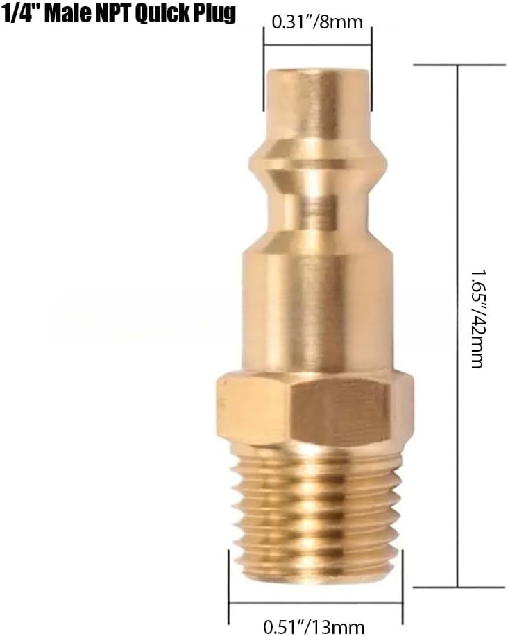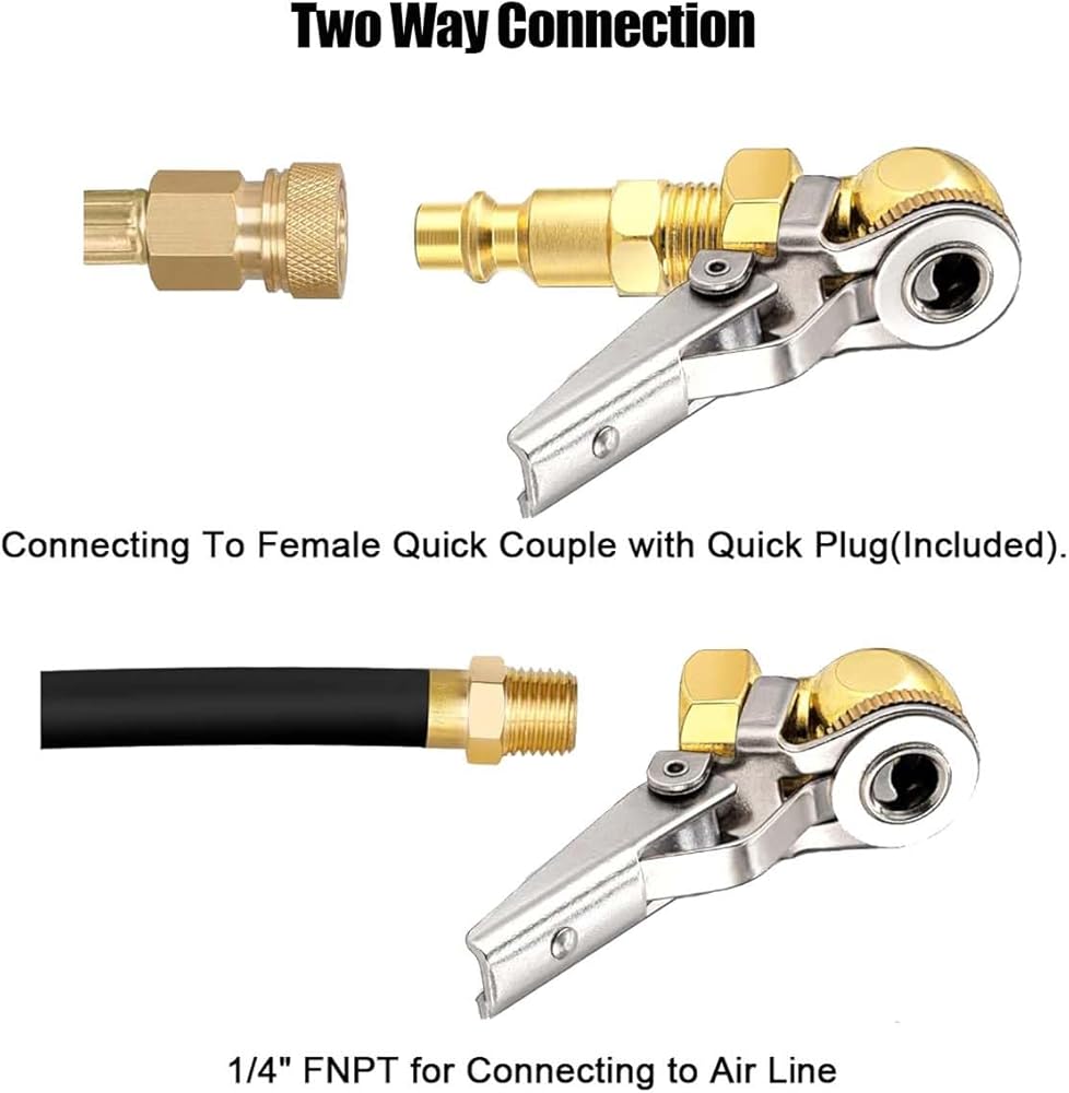2-Way Connection: You can connect the 1/4'' NPT thread closed ball pneumatic chuck directly to air lines by screwing it on, or use included standard 1/4'' quick plug for quick connections. Easily connected to air lines, air compressor or tire inflator gauges for tire inflation.