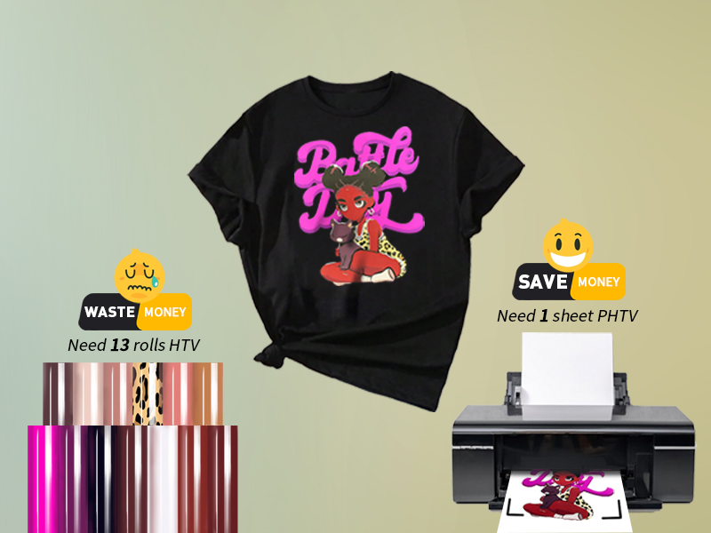 💕وفر المال ووفر الوقت: توفر PHTV حلاً مثاليًا للمشكلة التي تحتاجها HTV التقليدية إلى العديد من لفات HTV بألوان مختلفة لإكمال التصميم. يحل PHTV العملية المعقدة المتمثلة في عمليات الشراء المتكررة، والربط المتعدد، وتفريغ النفايات المتعددة. أنت الآن تحتاج فقط إلى ورقة PHTV واحدة لإكمال تصميمك المخصص بالألوان الكاملة، مما يوفر تكاليف الوقت والمال بشكل كبير. عملية النقل أبسط وأكثر كفاءة. اختيار الشركات الصغيرة.