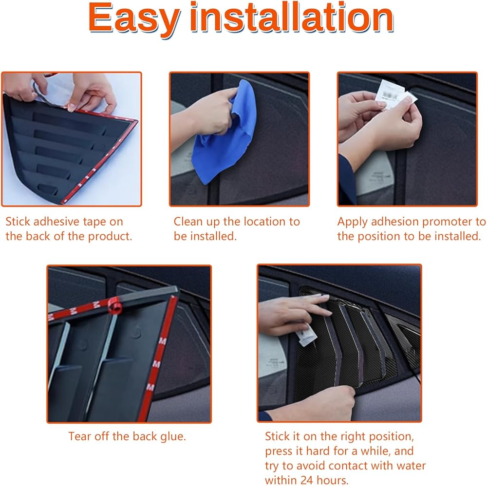• Easy Installation: With a simple peel-and-stick adhesive backing, these louvers can be installed easily without special tools or professional help, allowing you to upgrade your vehicle's style in no time.