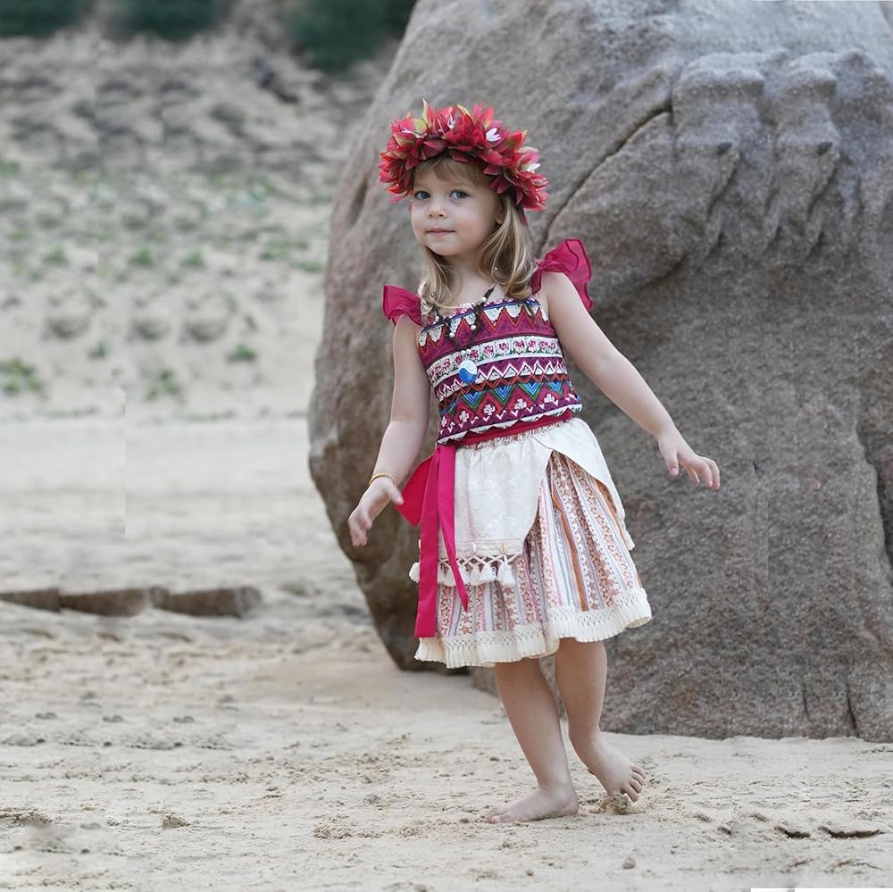 Unique Pendant: Adorned with a charming blue pendant that adds a touch of whimsy and completes the bohemian style.Vibrant Floral Headpiece: This stunning crown features lush green leaves and vibrant pink blossoms for a tropical, nature-inspired look.