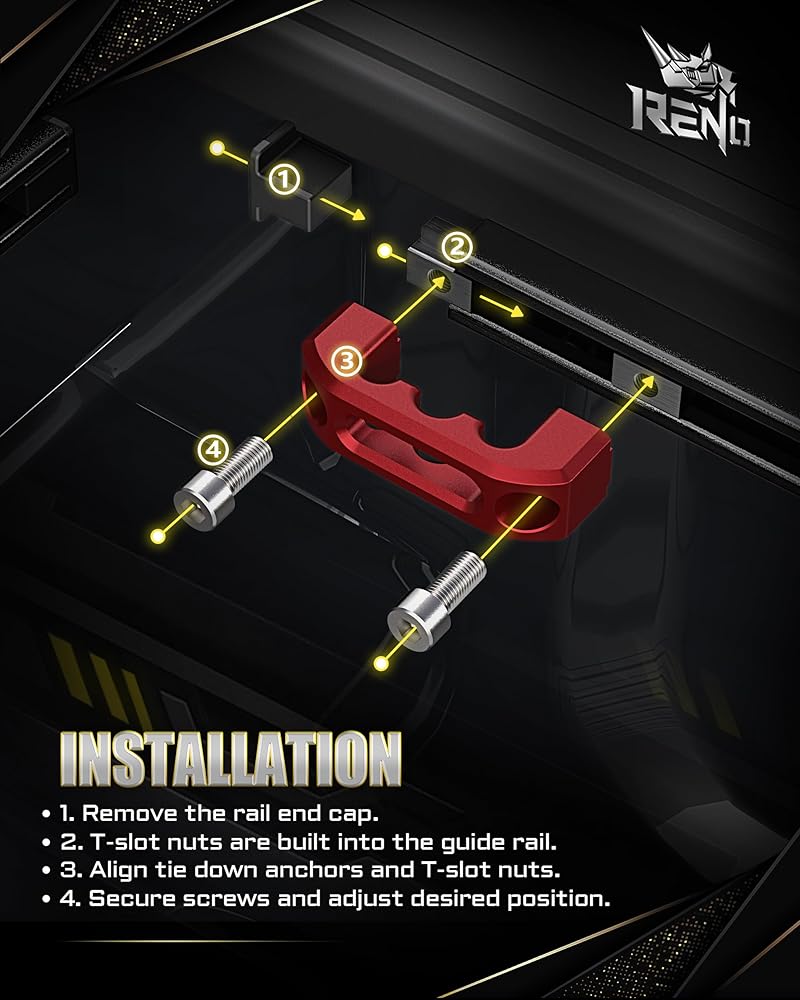 سهولة التركيب: تم تصميم RENO Bed Cleat للتركيب بدون متاعب. ما عليك سوى إزالة أغطية نهاية حاجز السرير، وإدخال صواميل ربط فتحة T في نظام القضبان، ثم قم بمحاذاة حاجز السرير وتثبيته بمسامير القفل. في غضون دقائق، يمكنك الحصول على مرساة قوية وموثوقة في مكانها