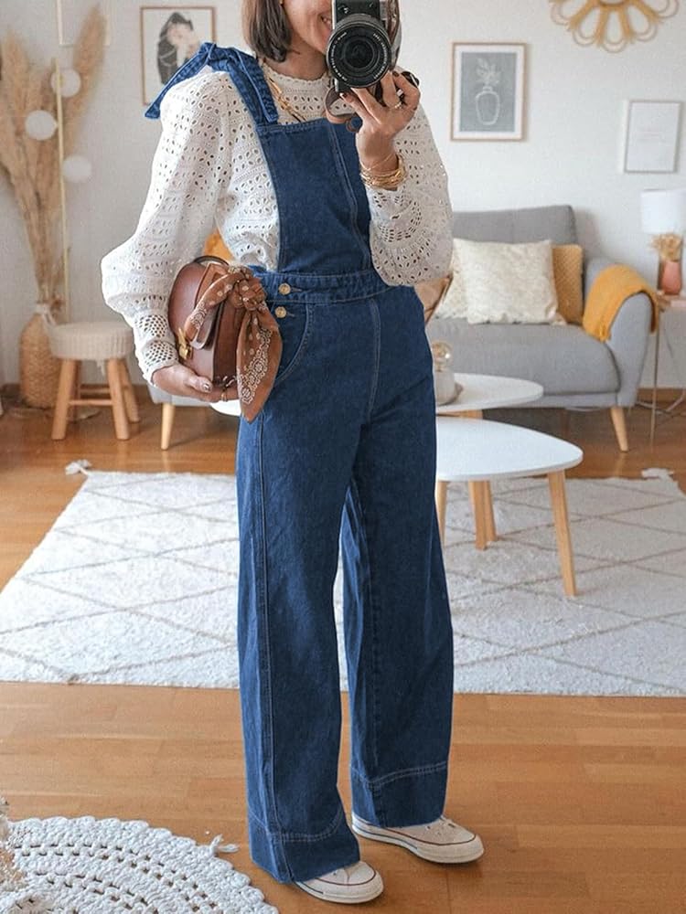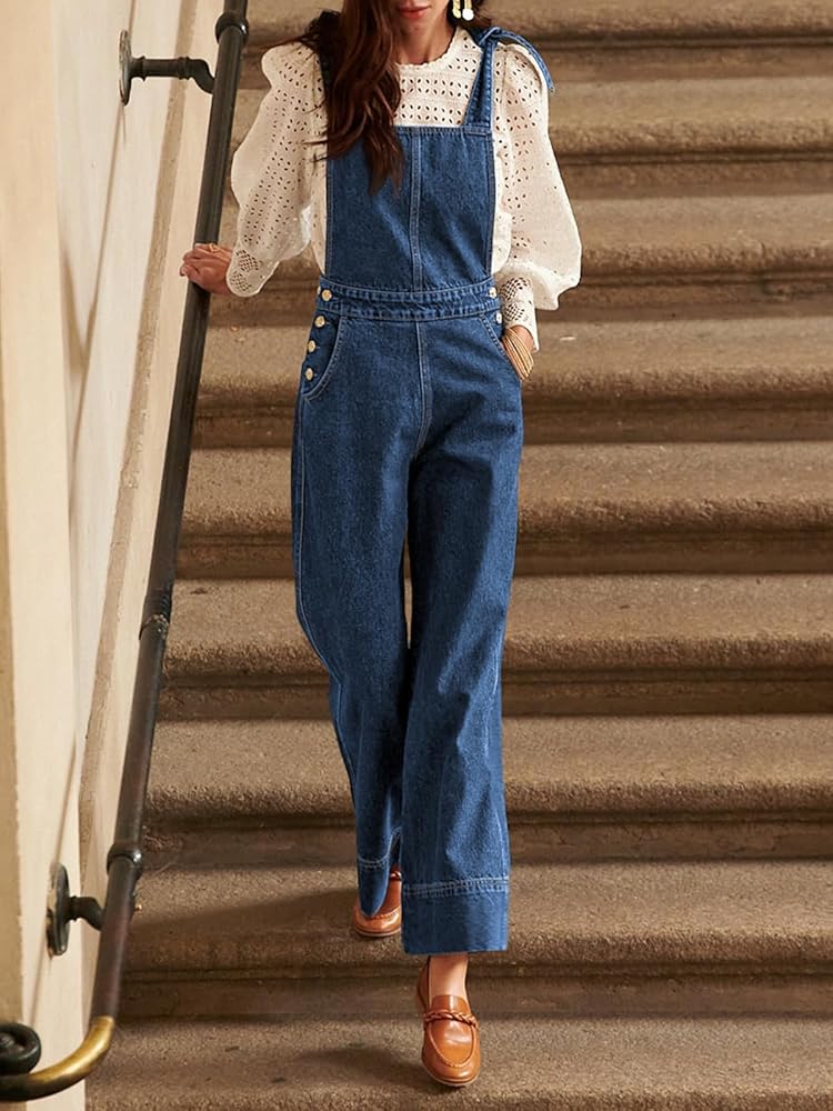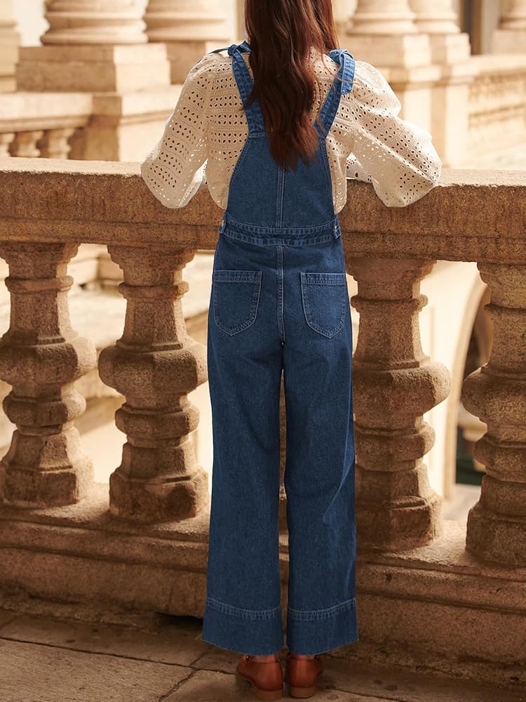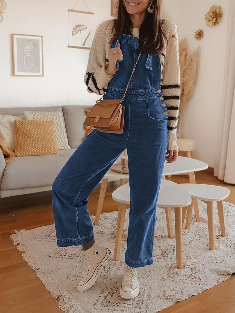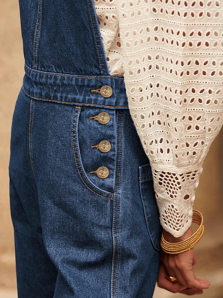 أفرول من الدنيم بطول الكاحل وقصة ساق واسعة مستقيمة. أزرار جانبية تقليدية لأعلى وأشرطة بإبزيم قابلة للتعديل. جيوب على الجوانب وأزرار على الخصر الجانبي. رقبة مربعة وظهر مكشوف. دينم خفيف ومريح مع مقاس قابل للتمدد.