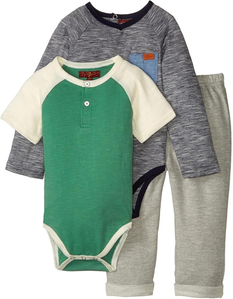 7 For All Mankind Boy's Three-Piece Bodysuit and Pant Set Textured Peacoat Canton Heather Grey-Cozy and comfortable, this three-piece set from 7 For All Mankind is perfect for any stylish little boy. Made from soft cotton/poly fabric, this set includes a two-tone raglan sleeve bodysuit with short sleeves, a long sleeve striped bodysuit with a chambray pocket and snap legs, and an elastic waist pull-on pant with cuffed bottoms.