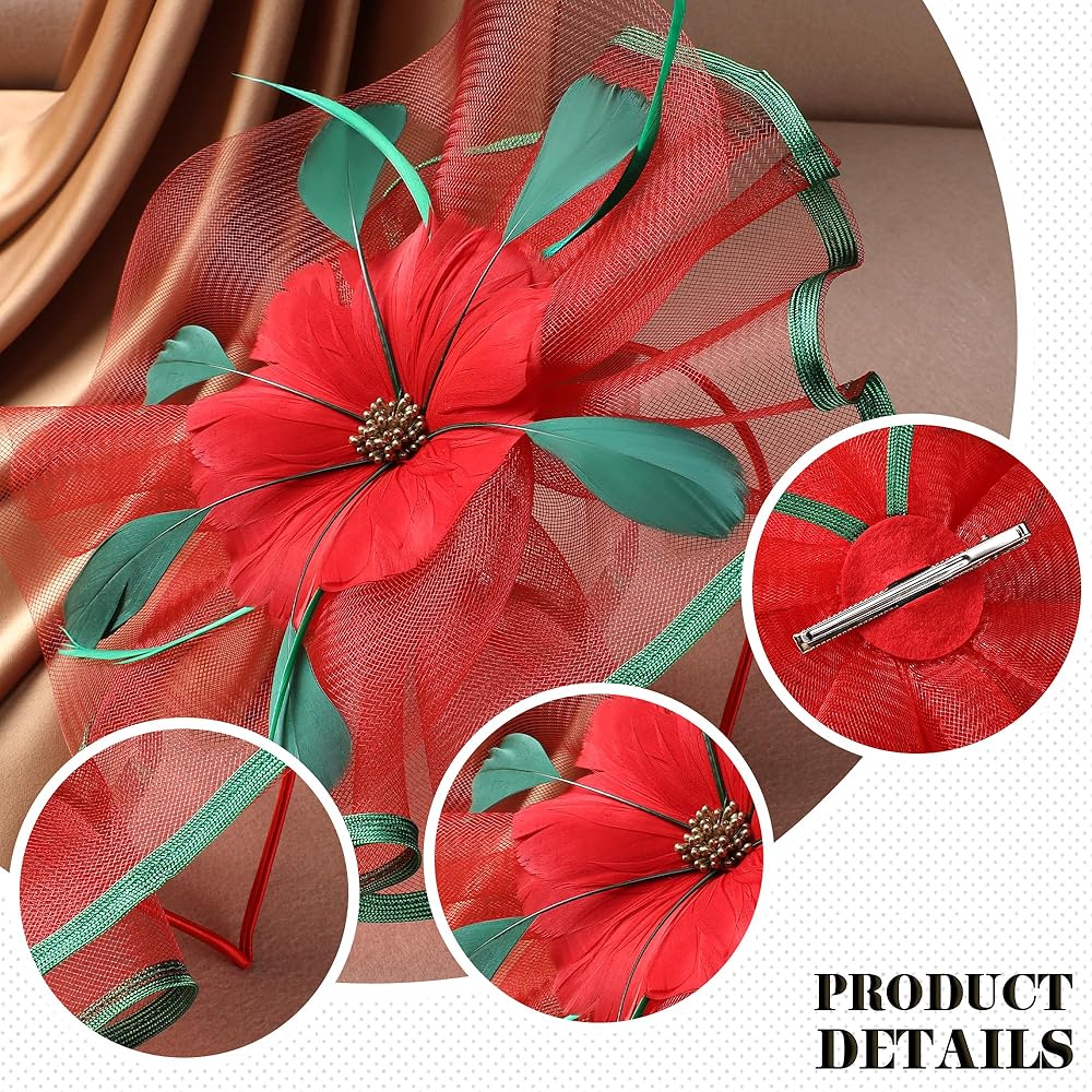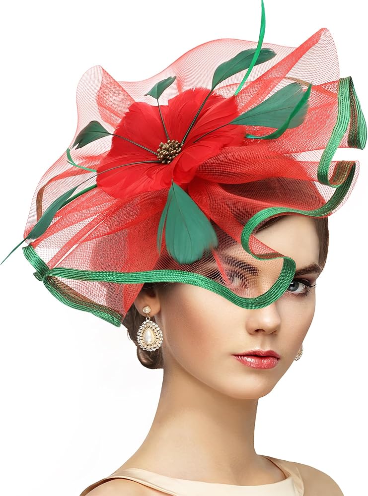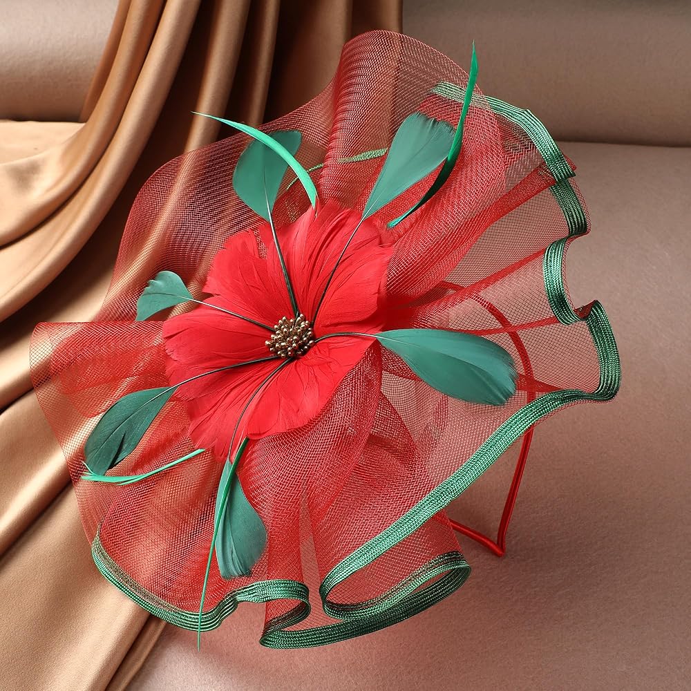 عصابة رأس شاي عيد الميلاد - 2024 قبعات كنتاكي ديربي باللونين الأخضر والأحمر مع مشبك أنيق، قبعة دائرية شبكية للكنيسة مع زهرة وريش لحفلات الهالوين النسائية وعيد الميلاد