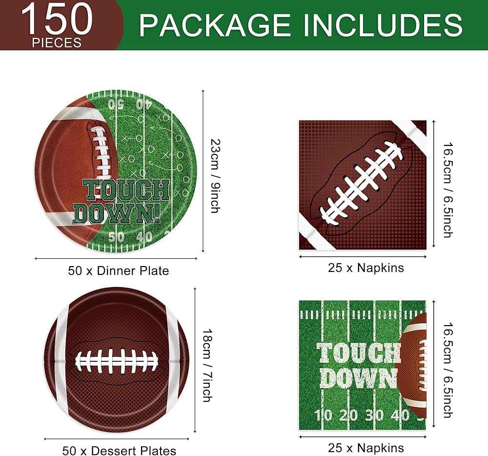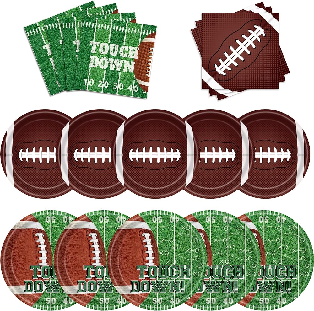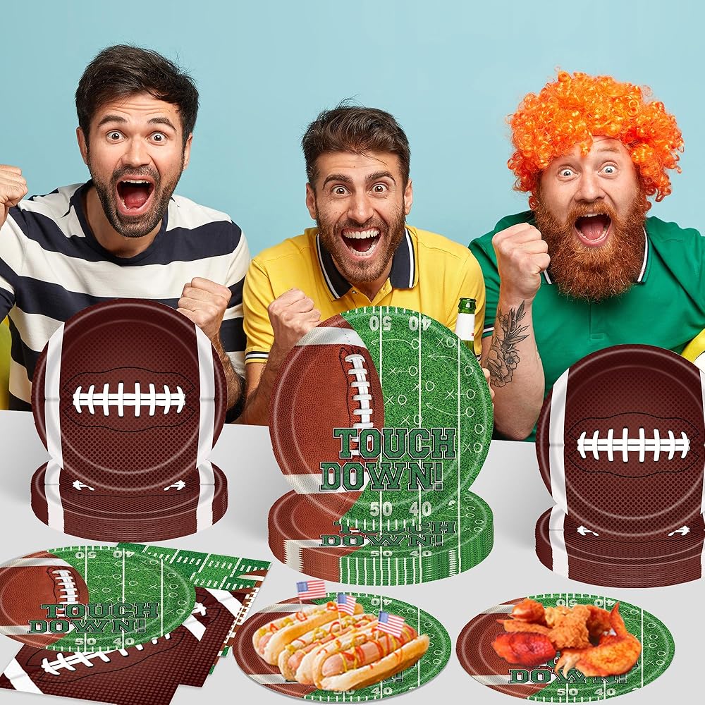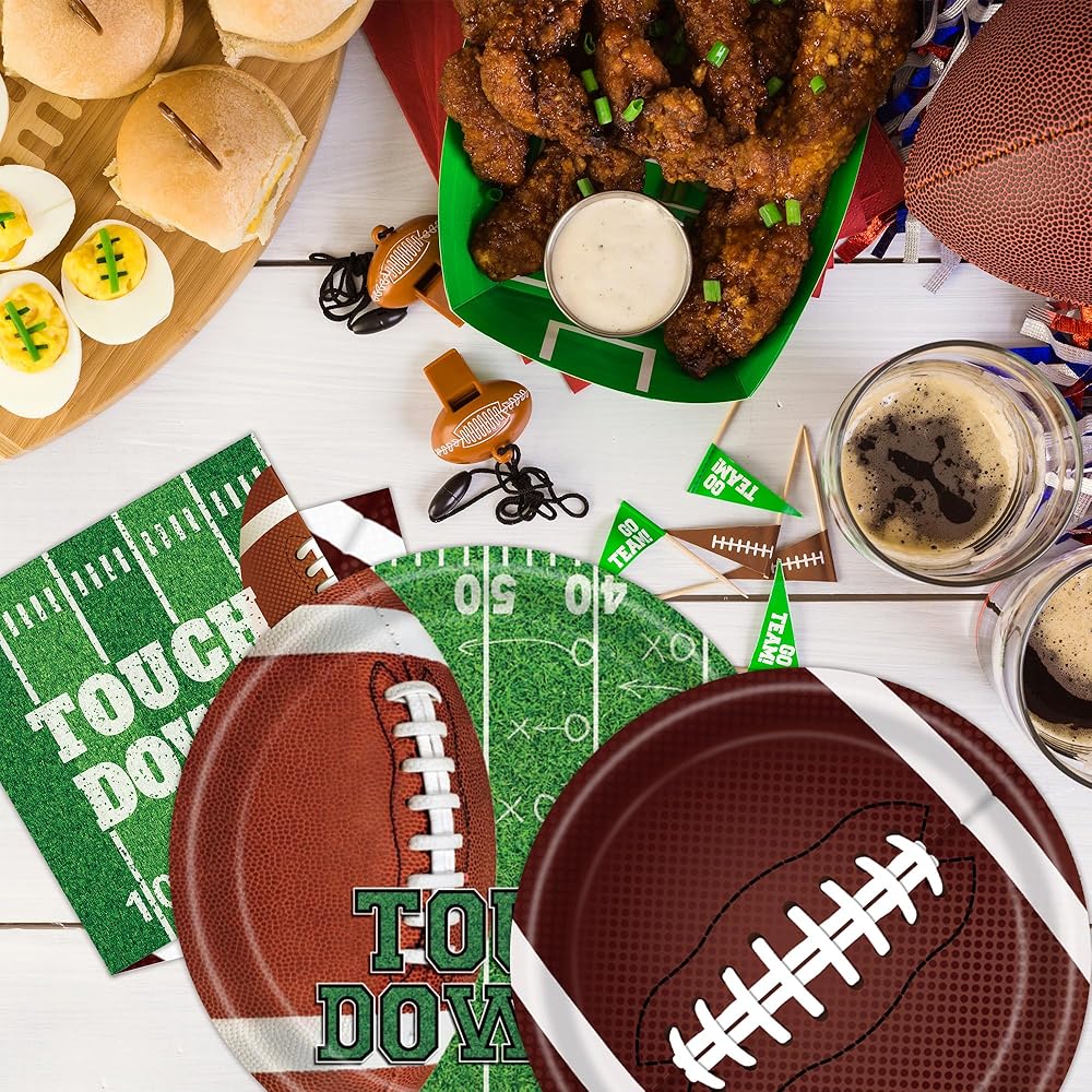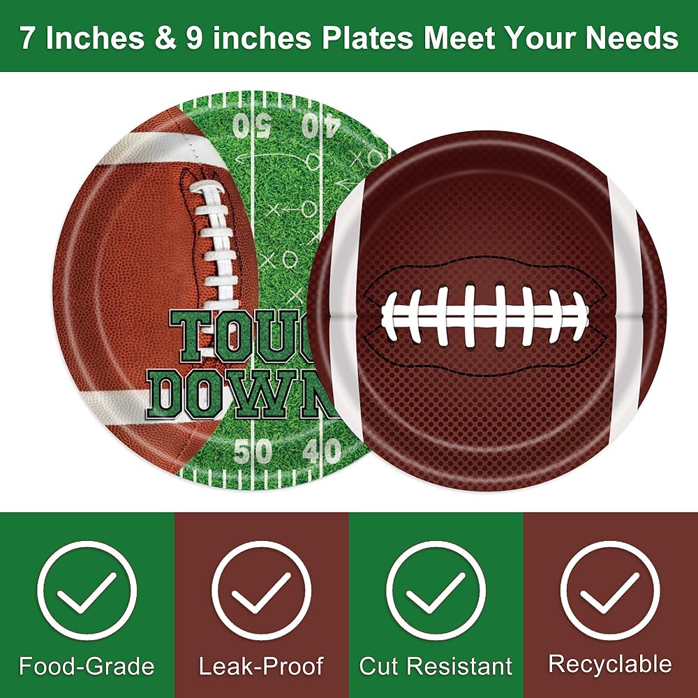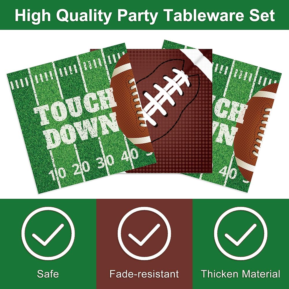 🏈【تصميم بطابع كرة القدم】: تم تصميم لوازم حفلات كرة القدم هذه بعناصر كرة القدم مثل كرة القدم، والميدان، والعشب الأخضر الأصلي، وخط الوسط، وخطوط اللمس، ومنطقة المرمى، ومنطقة التسجيل، وخطوط التجربة، وكلمات "TOUCH DOWN" على أطباق ومناديل حفلات كرة القدم لدينا، مما يضيف جوًا مثيرًا إلى ديكور حفلتك. سيكون تزيين حفلتك بديكورات حفلات كرة القدم الأمريكية خيارًا رائعًا.