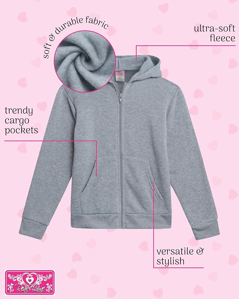COZY AND COMFORTABLE: Wrap your girl in the ultimate comfort with Real Love Girls' Sweatshirt Pack. Made from ultra-soft fleece, these girls sweatshirts are perfect for keeping warm during chilly days. Whether she's lounging at home or out with friends, our full zip up hoodie sweatshirts provide a snug fit. Ideal for kids clothes girls love, these sweatshirts are a must-have in girls' outerwear jackets & coats. Feel the Real Love with every wear!