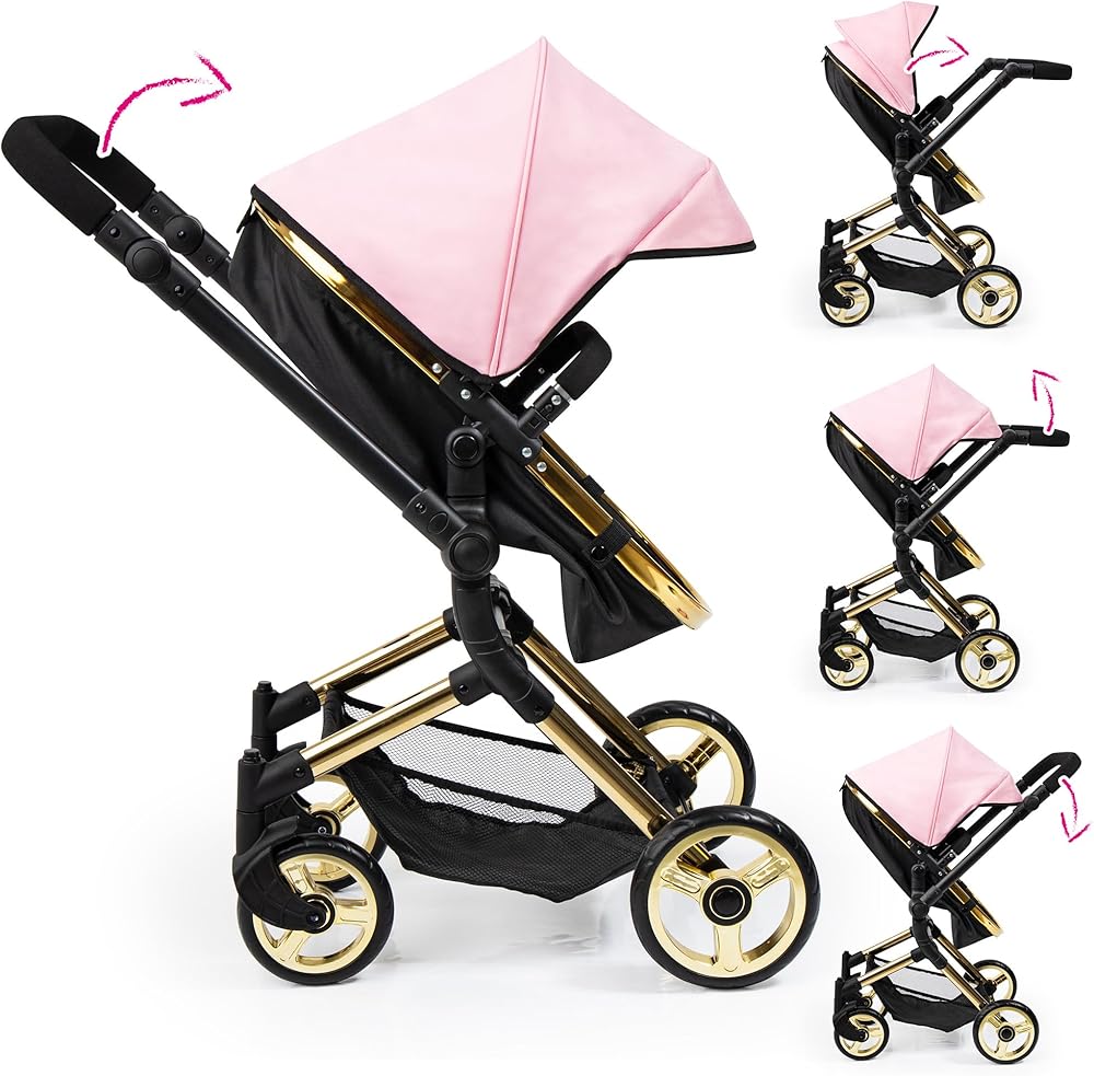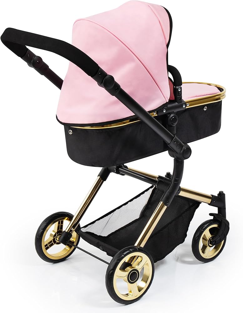 BAYER DESIGN DOLLS: PRAM NEO VARIO - PINK, BLACK, GOLD - Neo Vario is a modern combi doll's pram with a lovely black and pink design. Suitable for dolls up to 20 inches (52 cm). Adjustable: Equipped with an adjustable handle (ranging from 24" to 31"), Neo Vario effortlessly adapts to your child's height, ensuring comfort and ease of use during play. Direction changing: Whether your child prefers the carrycot to face forward or towards them, Neo Vario offers flexibility to suit their preferences. The pram features a reversible handle, allowing for easy maneuverability on both sides. Convertible: With the ability to change the angle of the carrycot, Neo Vario seamlessly transforms into a jogger pushchair with just a few simple steps. Easy Push: Maneuvering through various terrains is a breeze with Neo Vario's pivoted front wheels, guaranteeing stable cornering and smooth navigation. And when it's time to hit the road, this pram can be easily folded for convenient transportation and storage. Handbag: The accompanying bag is a practical addition, featuring a long handle for use as a shoulder bag and two short handles for hand-carrying, along with a secure zipper closure for added peace of mind. Plus, the integrated shopping basket offers ample storage space to keep all of your child's doll accessories neatly organized.