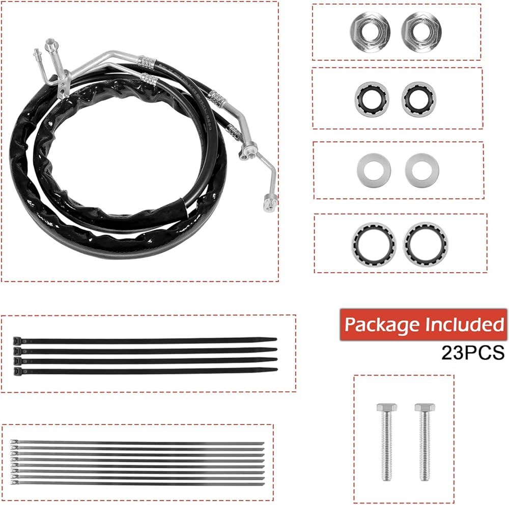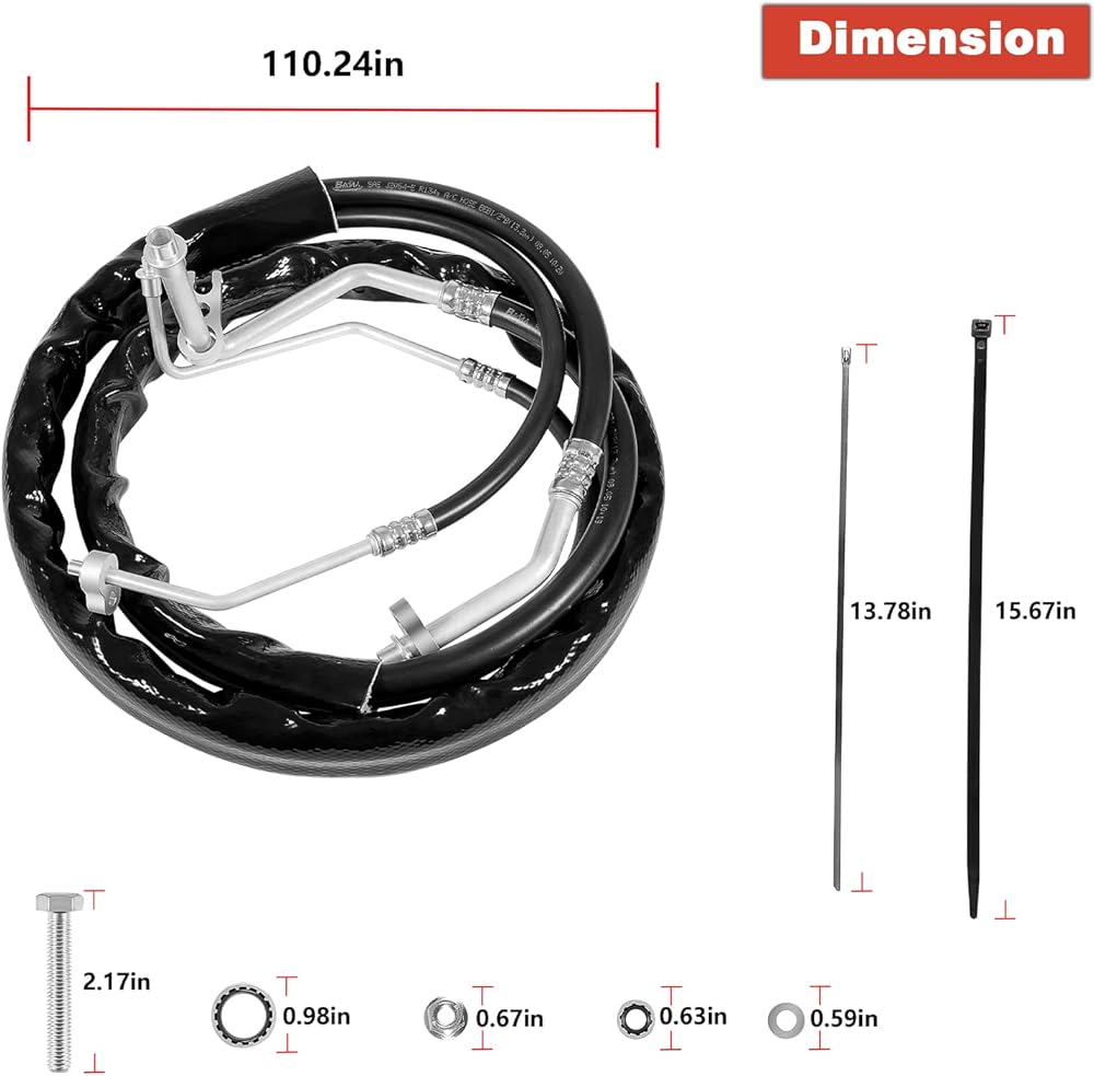 • 【مجموعة كاملة】مجموعة خراطيم التيار المتردد الخلفية كاملة الطول. بما في ذلك خطين خلفيين للضغط العالي والمنخفض للتيار المتردد (خطوط الشفط والتفريغ الخلفية) والصواميل والفواصل والمسامير وربطات السحاب. يمكن استخدام منتجنا لاستبدال أنبوب الألومنيوم الأصلي، لتجنب تسرب الهواء.