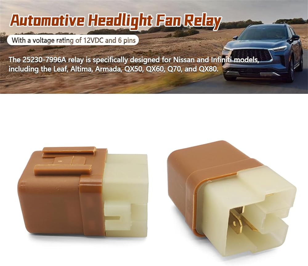 FITMENT: Replacement for Nissan Leaf Altima Armada; Replacement for Infiniti QX50 QX60 Q70 QX80. It is a 6-pin automotive headlight fan relay, with a voltage rating of 12V DC