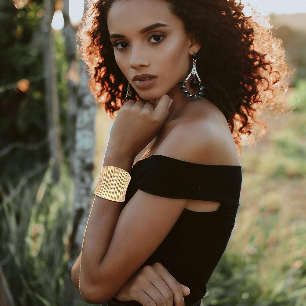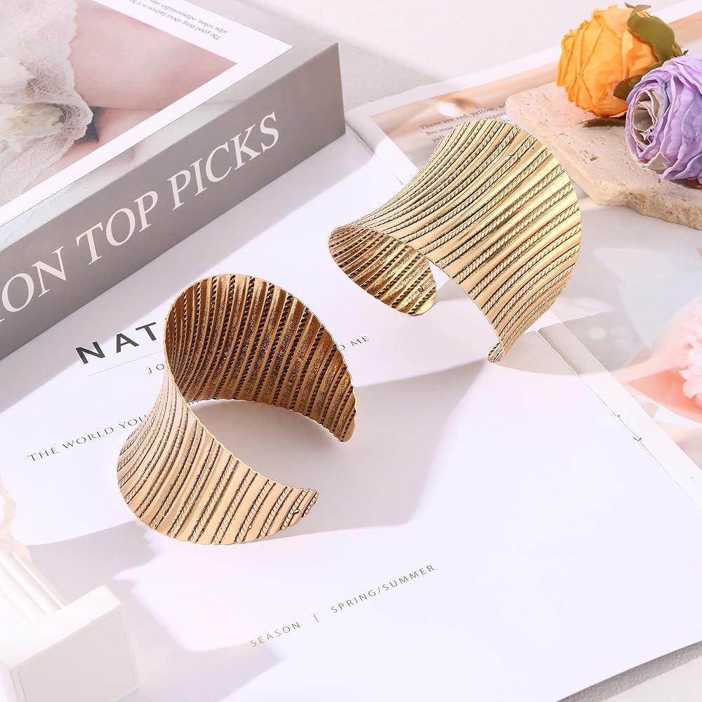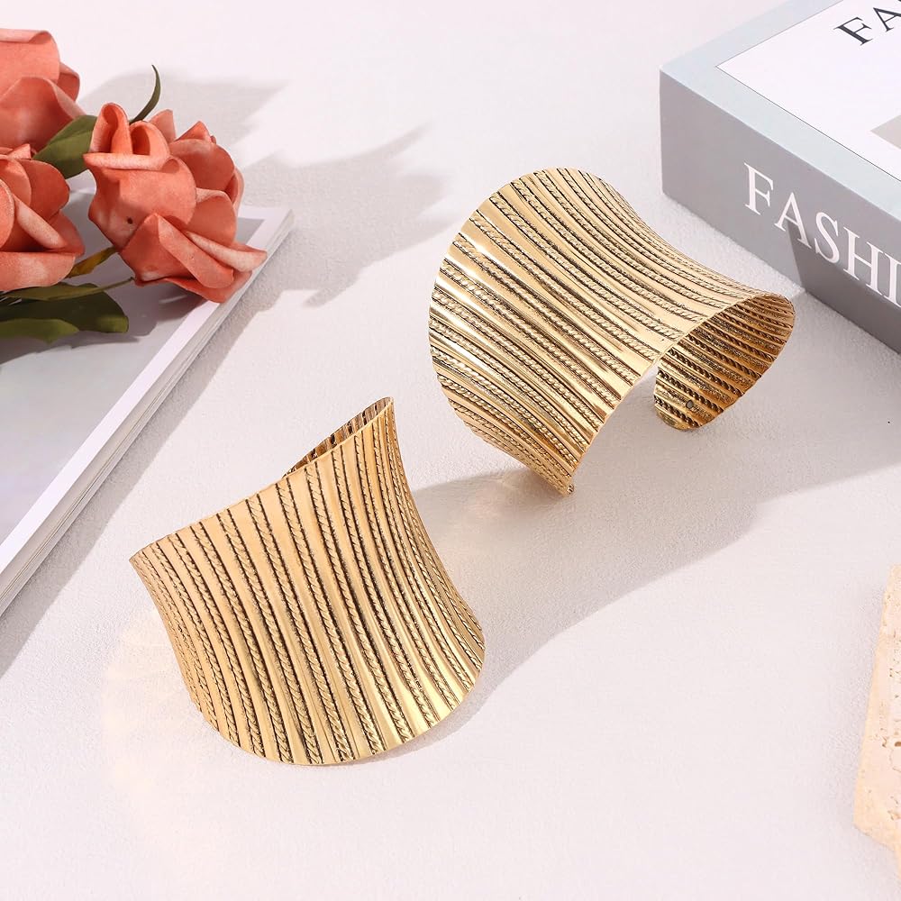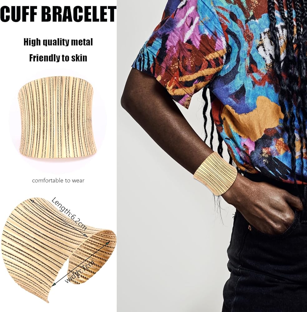 خامة عالية الجودة: أساور ذهبية للنساء مصنوعة من سبائك الزنك عالية الجودة. يمكن للسوار الذهبي أن يحافظ على اللمعان واللون دون تغيير لفترة طويلة. السوار الذهبي الكبير لا يحتوي على الرصاص والنيكل، ولا يسبب الحساسية ولا يضر الجلد.