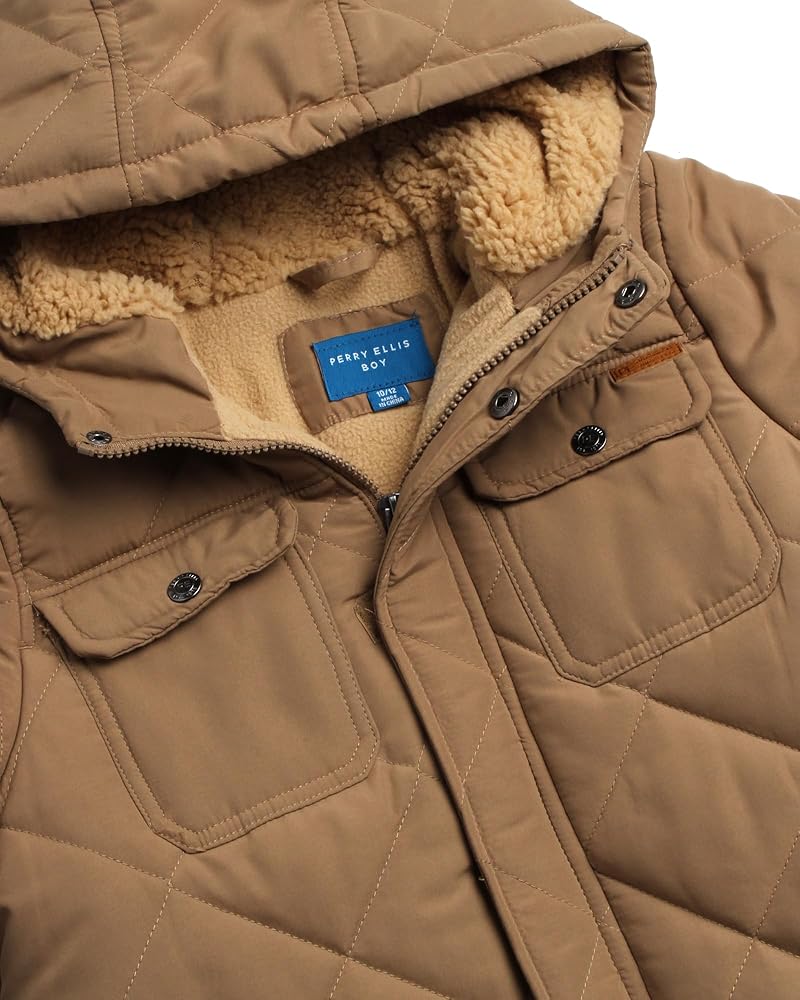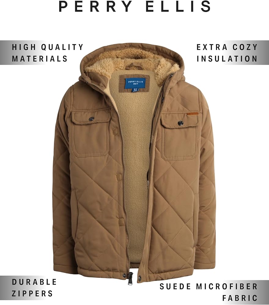 COZY QUILTED JACKET: Keep your boy warm and stylish with Perry Ellis Boys Winter Jacket, a suede microfiber quilted jacket with a cozy hood; Designed for chilly days, this insulated outerwear provides superior warmth and comfort, perfect for outdoor adventures
