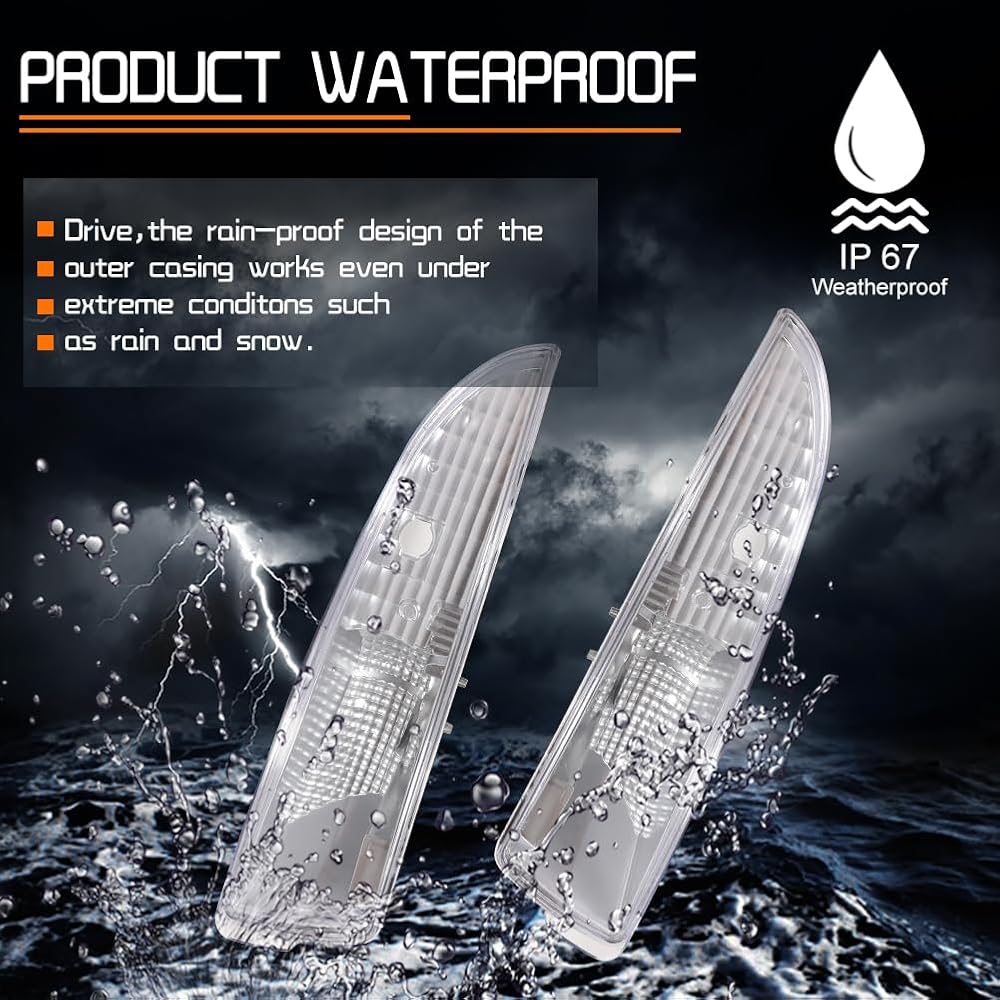 • ➤Sealed and Waterproof: plastic housing processed with ultrasonic treatment,anti-scratch, no faded with long-time exposure and can adapt to all kind of extreme weather,no moisture inside after a heavy rain or car wash.Waterproof IP65, shockproof, dustproof,
