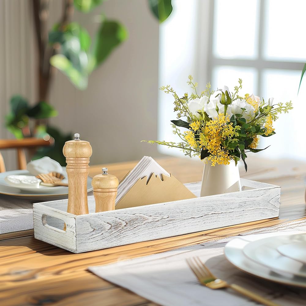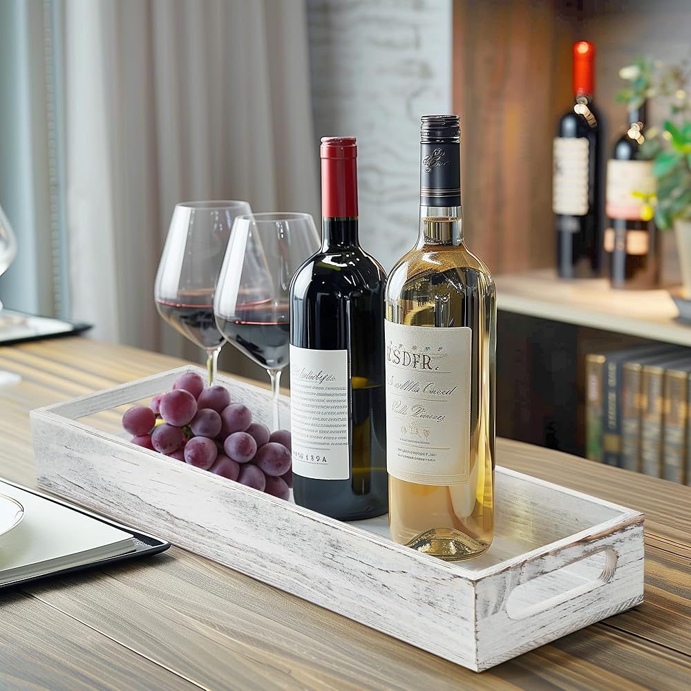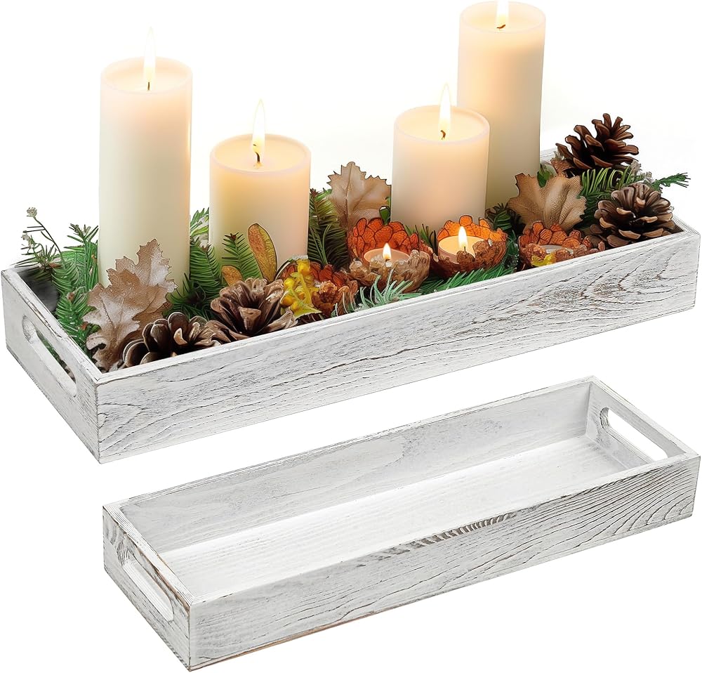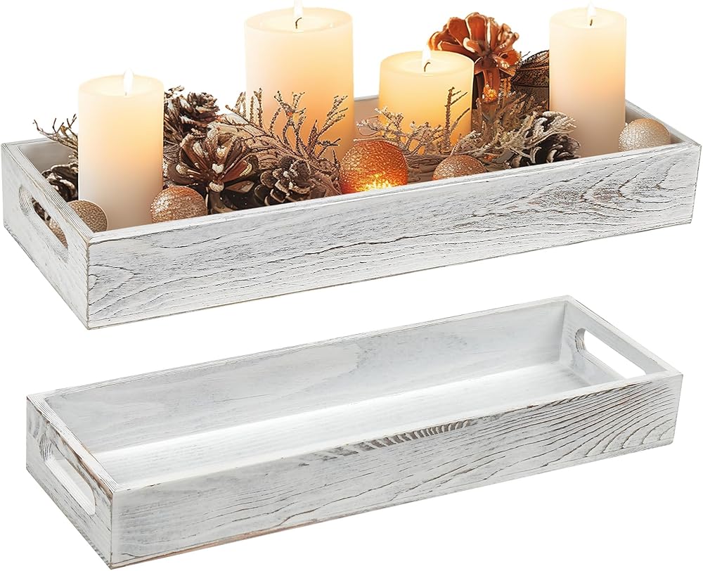 ديكور القطعة المركزية: ستضيف الصينية الخشبية المطلية باللون الأبيض لمسة ريفية لطيفة إلى أي مساحة؛ رائعة للاستخدام كقطعة مركزية مزخرفة مع الشموع والزهور والنباتات وغيرها من الديكورات المنزلية على طاولة الطعام أو طاولة القهوة أو جزيرة المطبخ أو طاولة الزينة أو المسند أو سطح الطاولة.