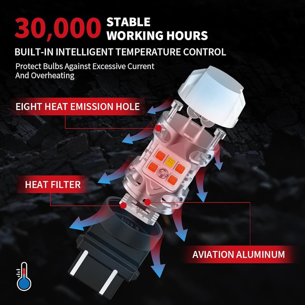 【عمر افتراضي طويل يصل إلى 30,000 ساعة】تتميز مصابيح T3 3157 CK 4157 CK LED الجديدة بنظام ذكي للتحكم في درجة الحرارة (ITCS)، مما يحافظ على برودة هذه اللمبة في الأيام الأكثر حرارة. موجود في غلاف من الألومنيوم مع لمسة نهائية مزخرفة لتحقيق أقصى قدر من خصائص المبدد الحراري. أضف إليها زعانف فلتر الحرارة الداخلية التي تزيد من تبريد الضوء، وتضمن عمرًا أطول.