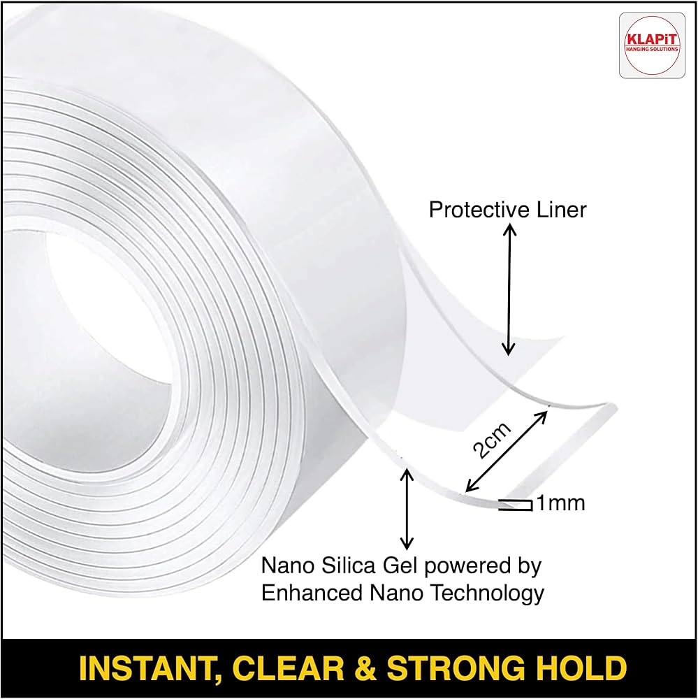 شريط KLAPiT فائق التحمل مزدوج الجوانب مع تقنية النانو المحسنة يحمل ما يصل إلى 500 رطل للمنزل والمكتب والمطبخ والحمام للجدران والخشب والمعادن والزجاج والسيراميك [65.6 قدم] (عبوة من قطعتين)