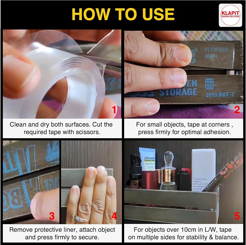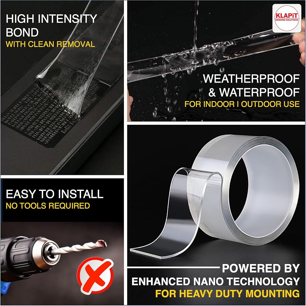 • شريط تثبيت عالي التحمل مزدوج الجوانب: يستخدم شريط KLAPiT SUPER TAPE تقنية النانو المحسنة لتحمل ما يصل إلى 500 رطل/230 كجم ويبلغ طوله 65.6 قدمًا