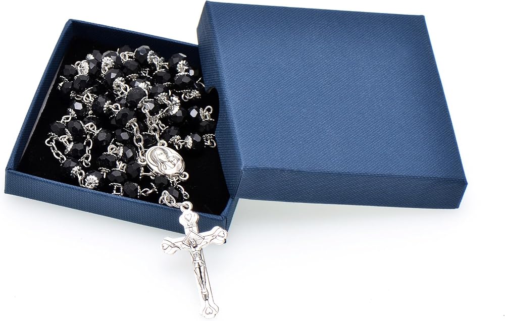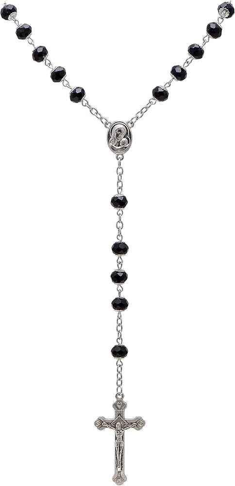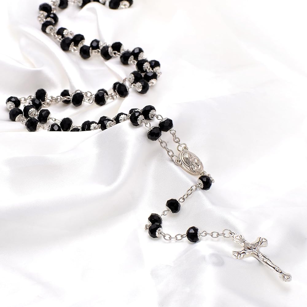 • 8mm pure black faceted crysal beads capped, total 59pcs rosary beads are hand wired and linked up the rosary chain, all arranged according to Roman Catholic Rosary